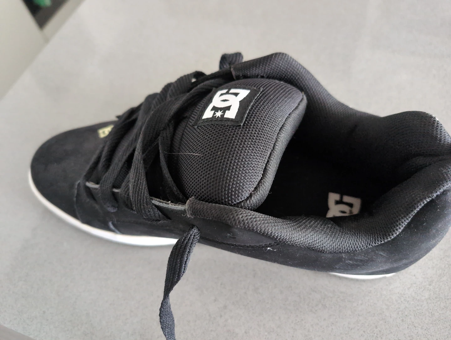 Black DC skate shoes. Suede and mesh upper with lace-up closure. Rubber sole. Great for everyday wear and skating.