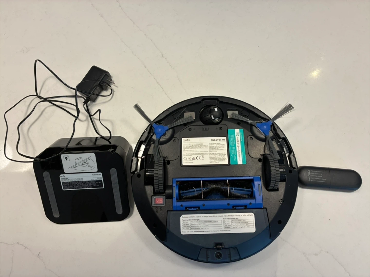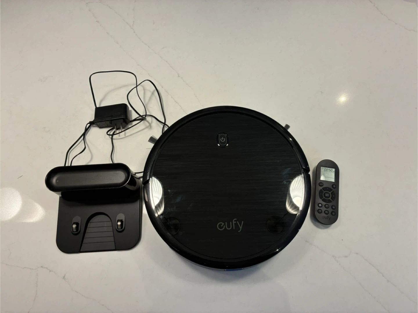 This Eufy RoboVac 11S is a slim robot vacuum cleaner. It comes with its charging base, power adapter, and a remote control. This vacuum is designed for easy floor cleaning. eufy T2108 RoboVac 11S