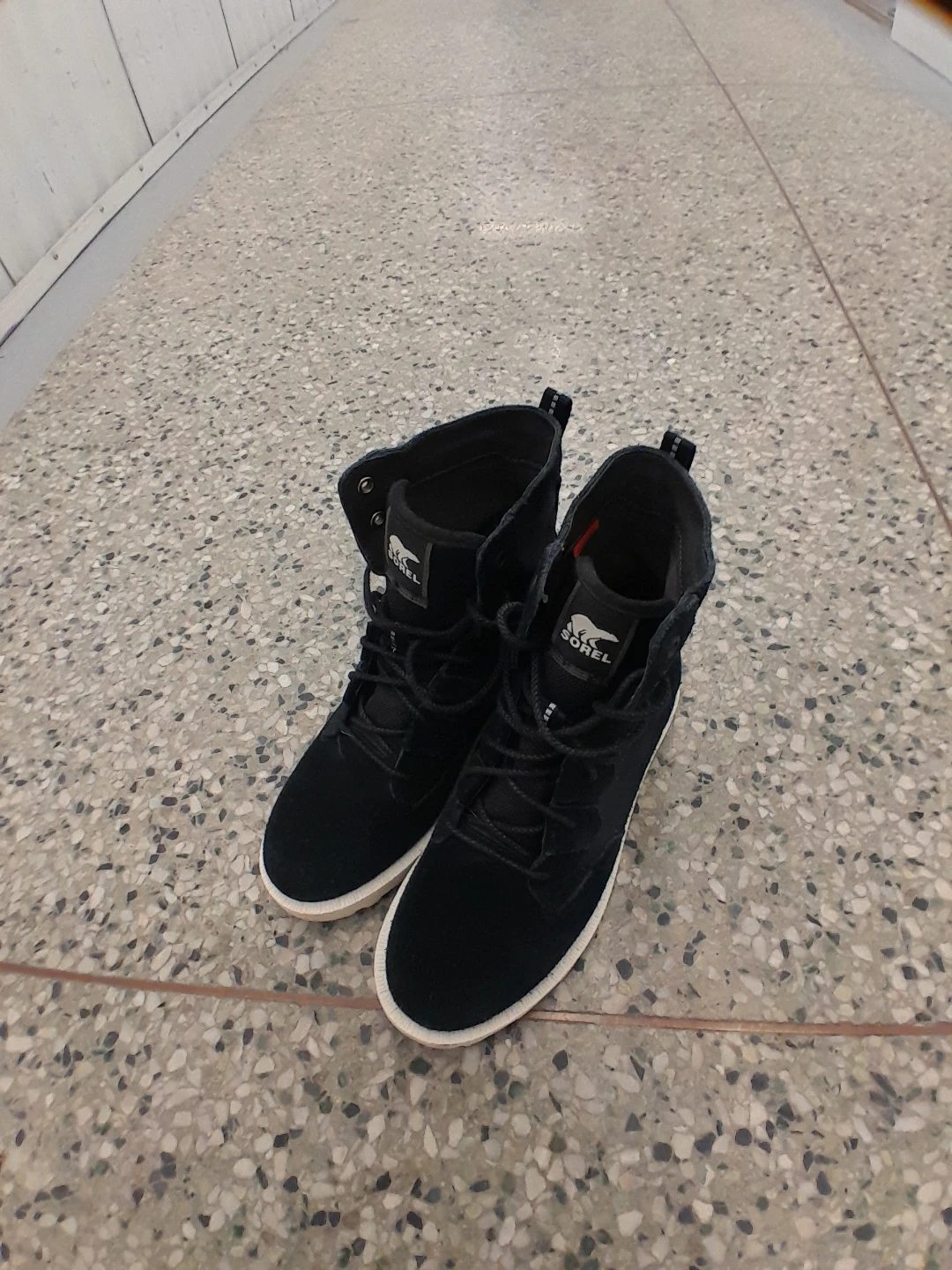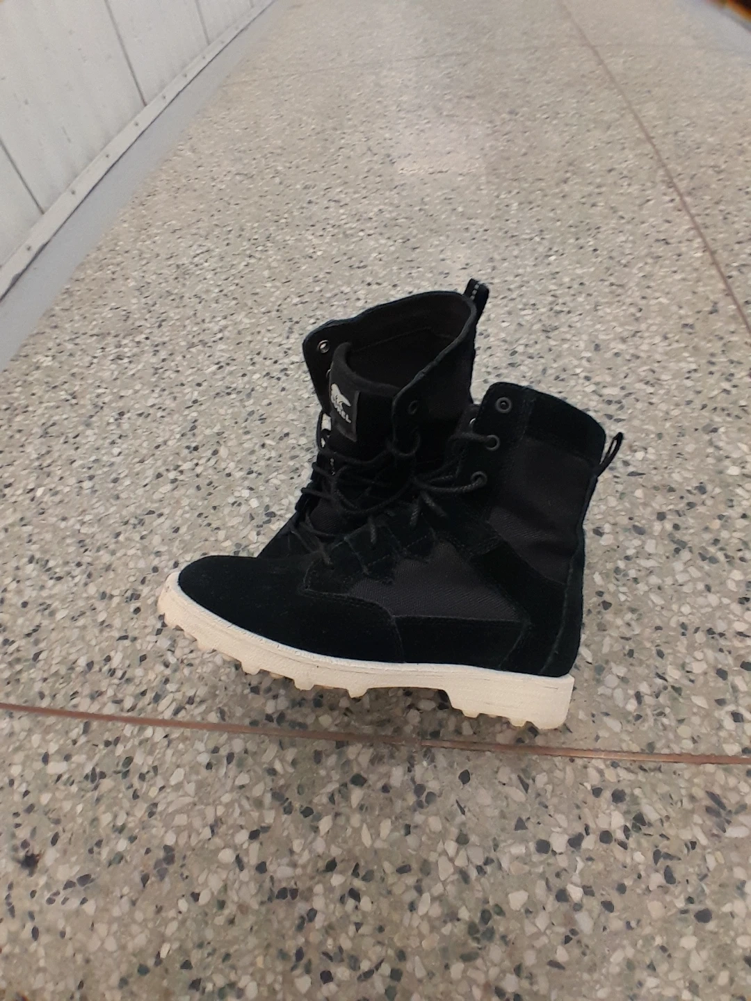 Sorel black winter boots. These boots are designed for warmth and traction in cold weather. They feature a lace-up closure for a secure fit women's size 7.5