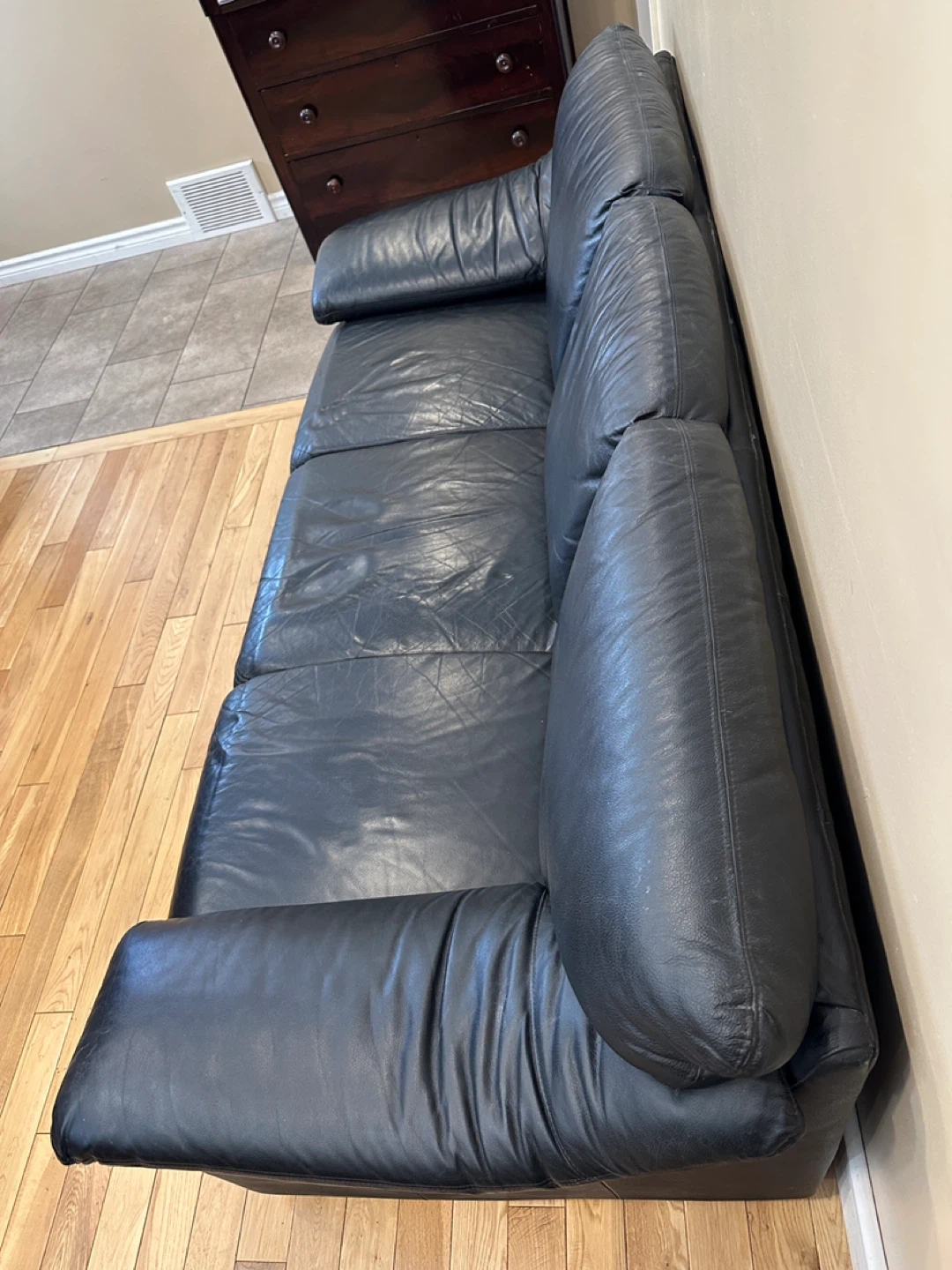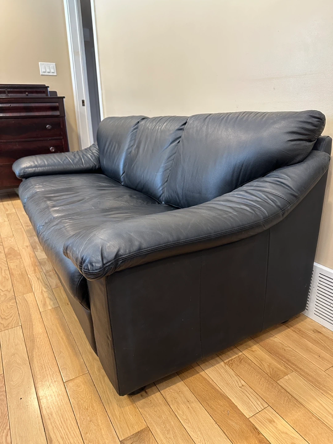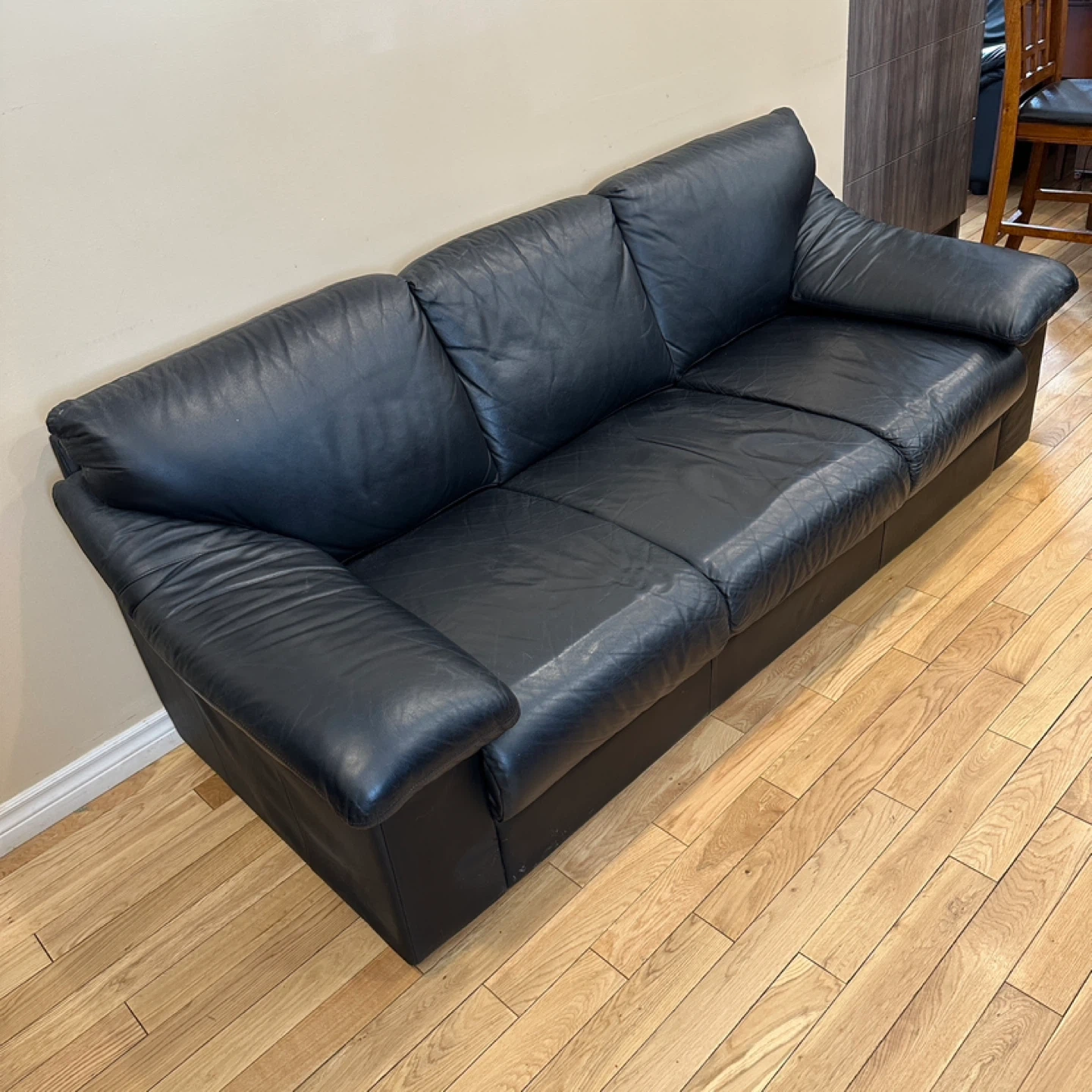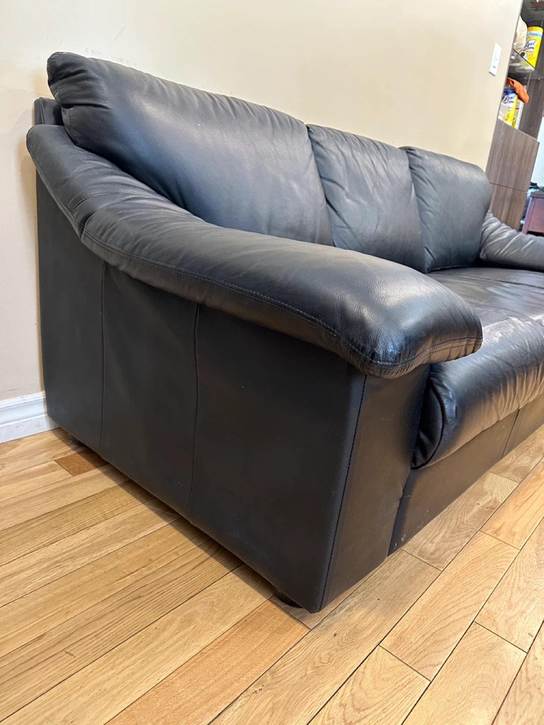 Comfortable and stylish genuine leather sofa in good condition. Classic modern design with wide padded arms and supportive cushions. Perfect for a living room, office, or apartment.