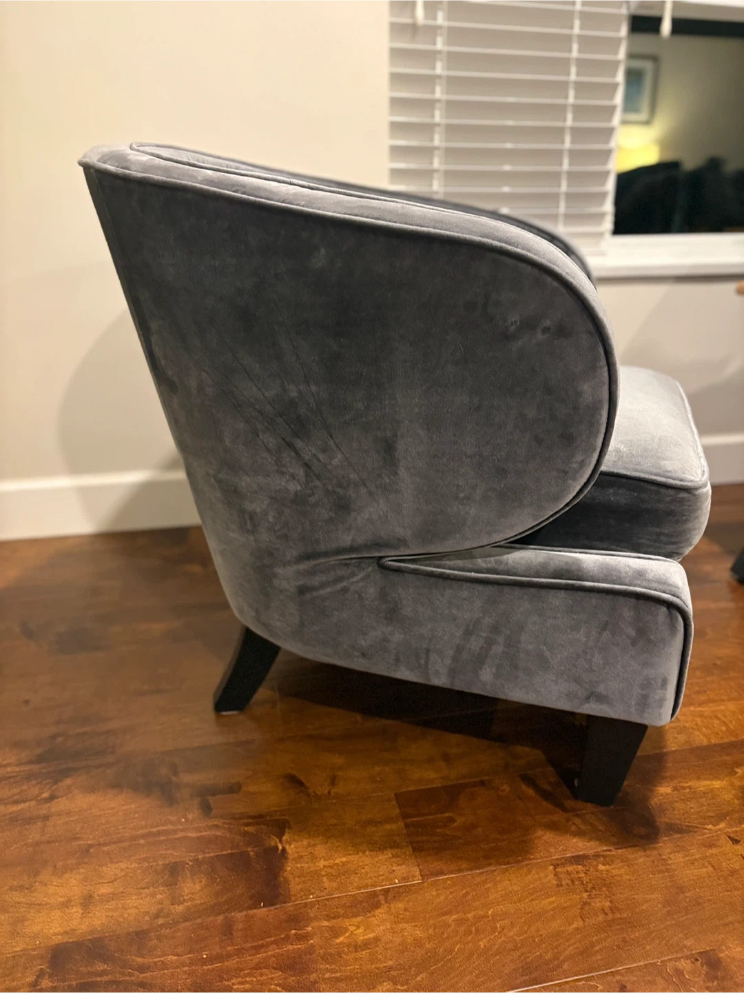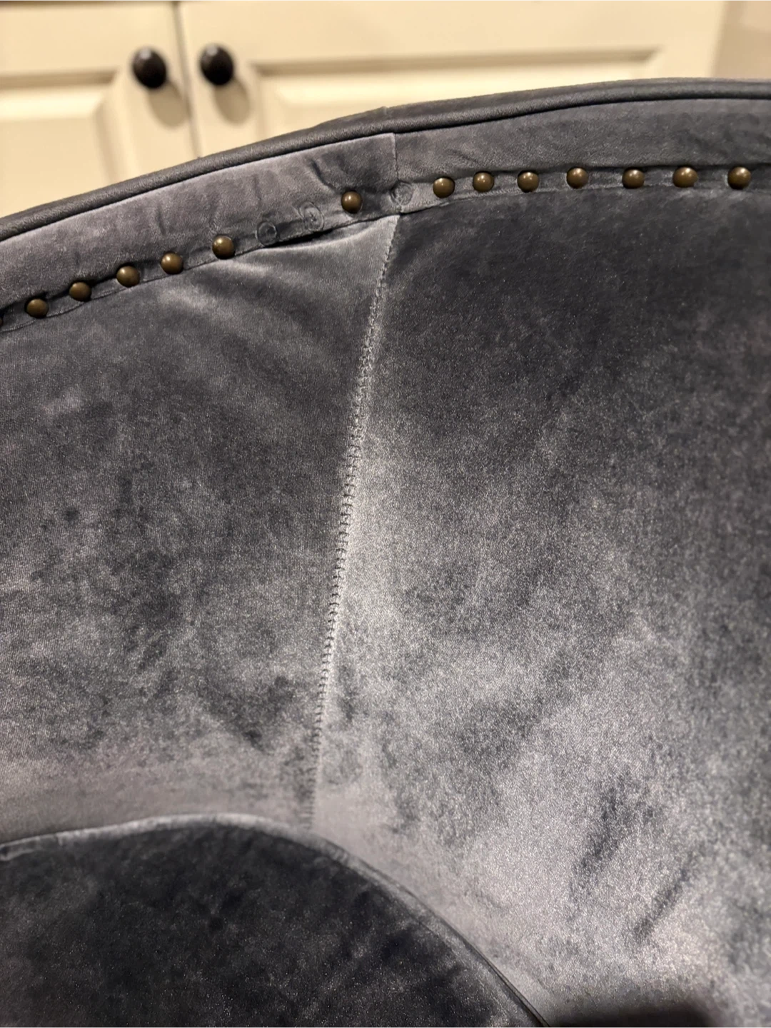 This stylish accent chair is upholstered in soft grey velvet. It features decorative brass nailhead trim along the curved backrest. The chair's compact size makes it a versatile addition to any room.