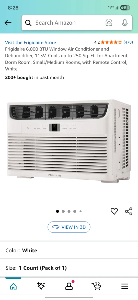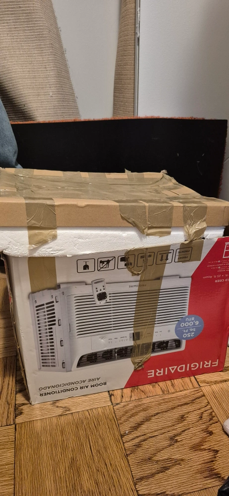 Frigidaire 6,000 BTU window air conditioner. It's white and comes with the box. Perfect for small to medium rooms up to 250 sq ft! It also functions as a dehumidifier. Includes a remote control for easy operation. Only used for one summer.