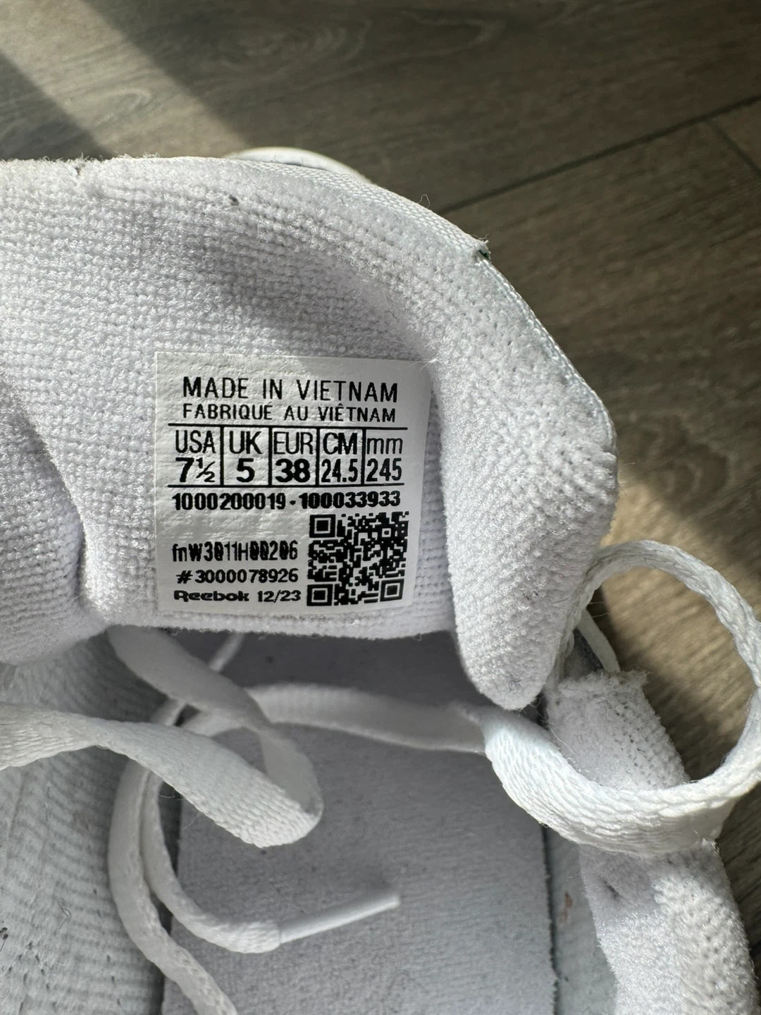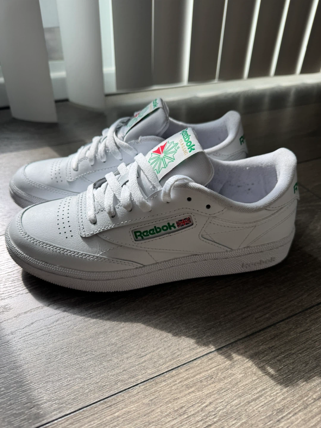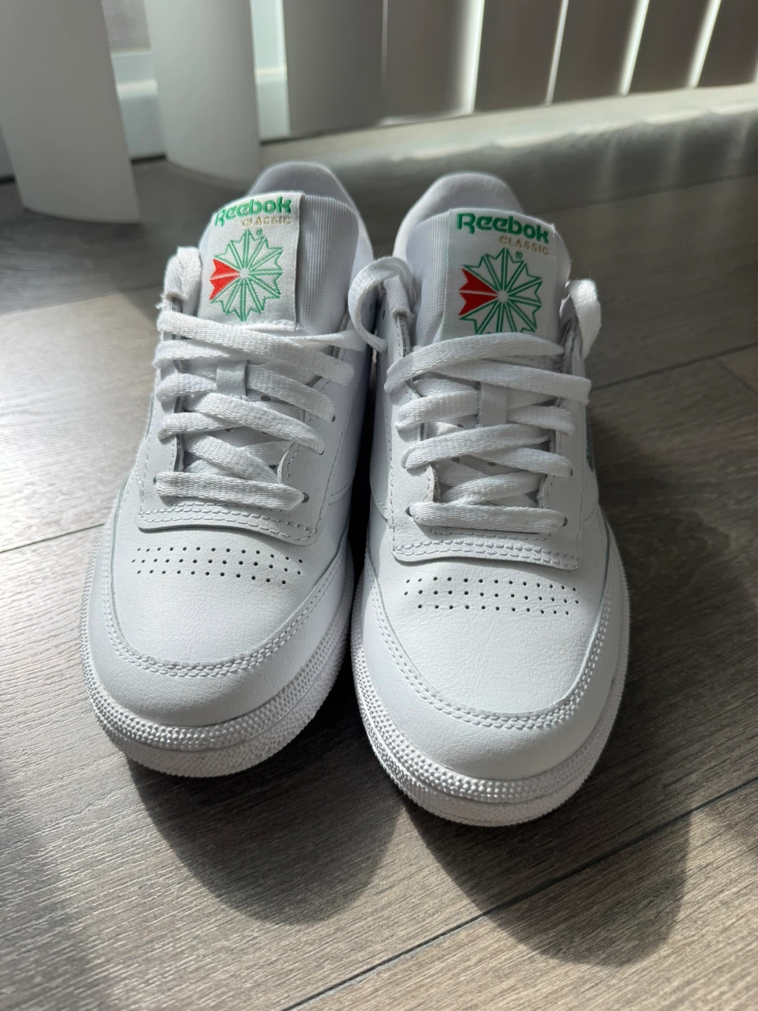 Classic white leather sneakers with green Reebok branding. Size 7.5 US women's, 5 UK, 38 EUR, 24.5 CM. Made in Vietnam, manufactured 12/23. Perfect for everyday wear!