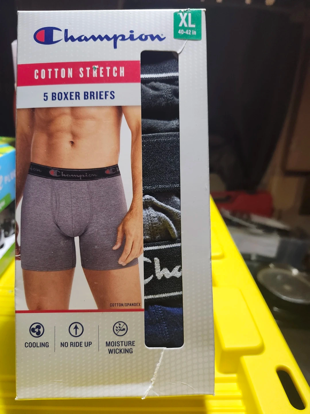 Champion cotton stretch boxer briefs. This 5-pack comes in size XL. They're made with a cotton/spandex blend and offer cooling, no-ride-up, and moisture-wicking properties.
