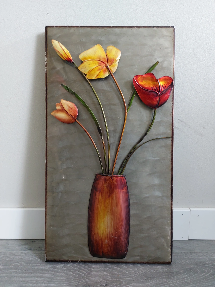 Beautiful metal wall art featuring a bouquet of flowers in a vase. Features 3D flowers and vase that pops. Adds a touch of elegance to any room.