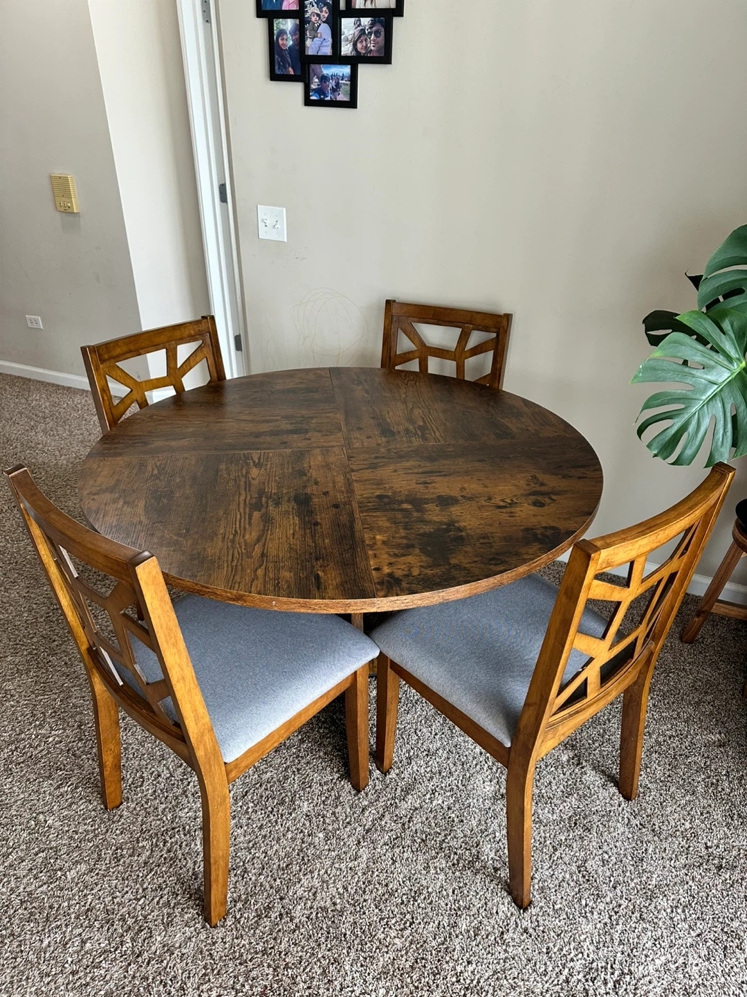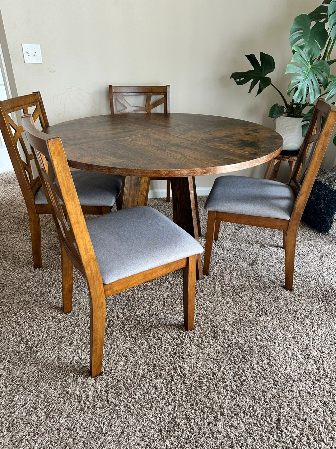 This set includes a round dining table and four chairs. The table features a wooden top with a rustic finish. The chairs have wooden frames and upholstered gray seats. These were rarely used about 1.5 years old in excellent condition. They're a great addition to any dining space!