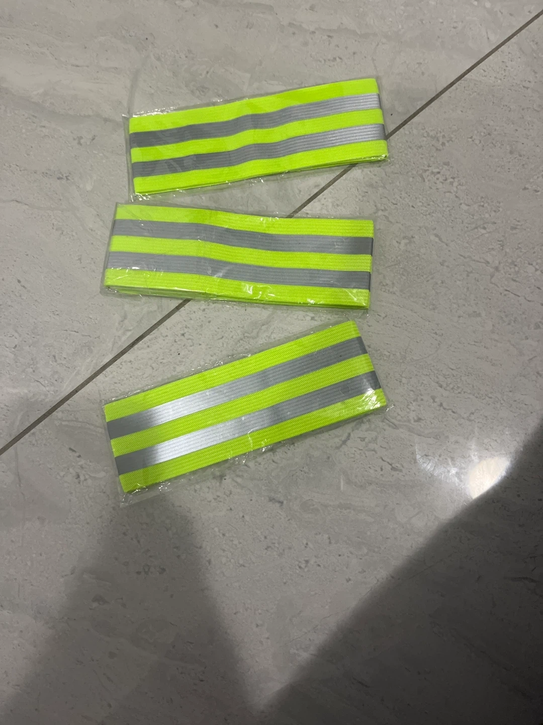 Three elastic bands with bright neon yellow and silver reflective stripes. These bands are great for increasing visibility during nighttime activities. Made of durable, flexible material.