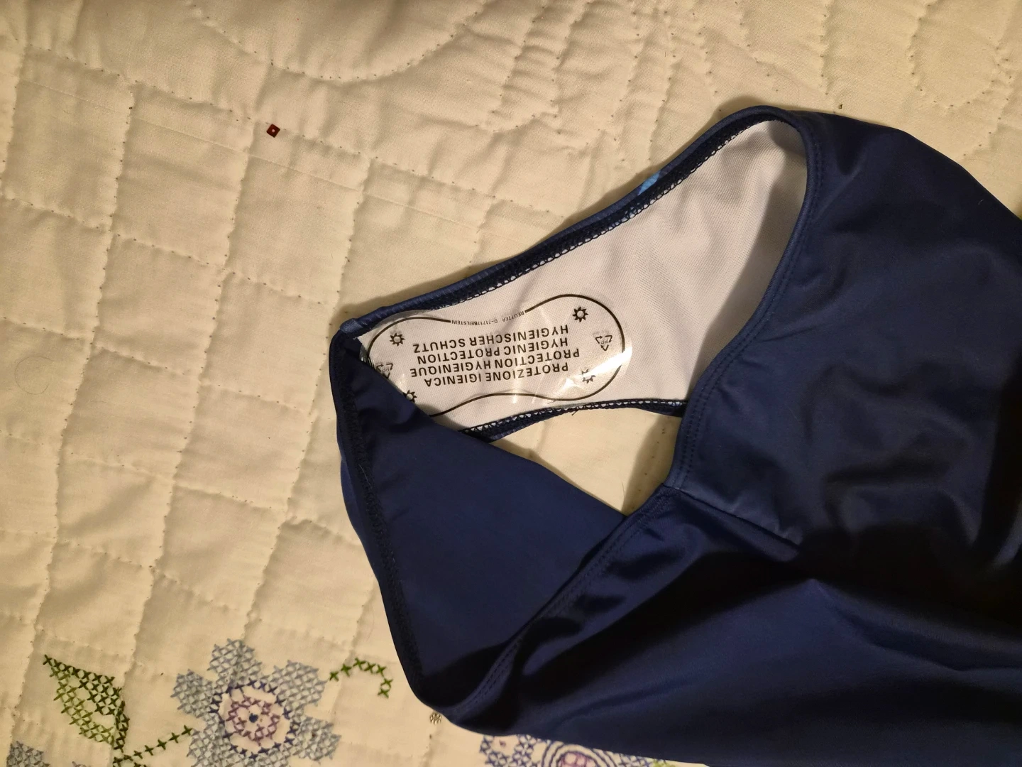 A classic navy blue one-piece swimsuit with contrasting light blue accents. It's made from a stretchy, quick-drying material. This suit is comfortable for swimming or lounging by the pool.