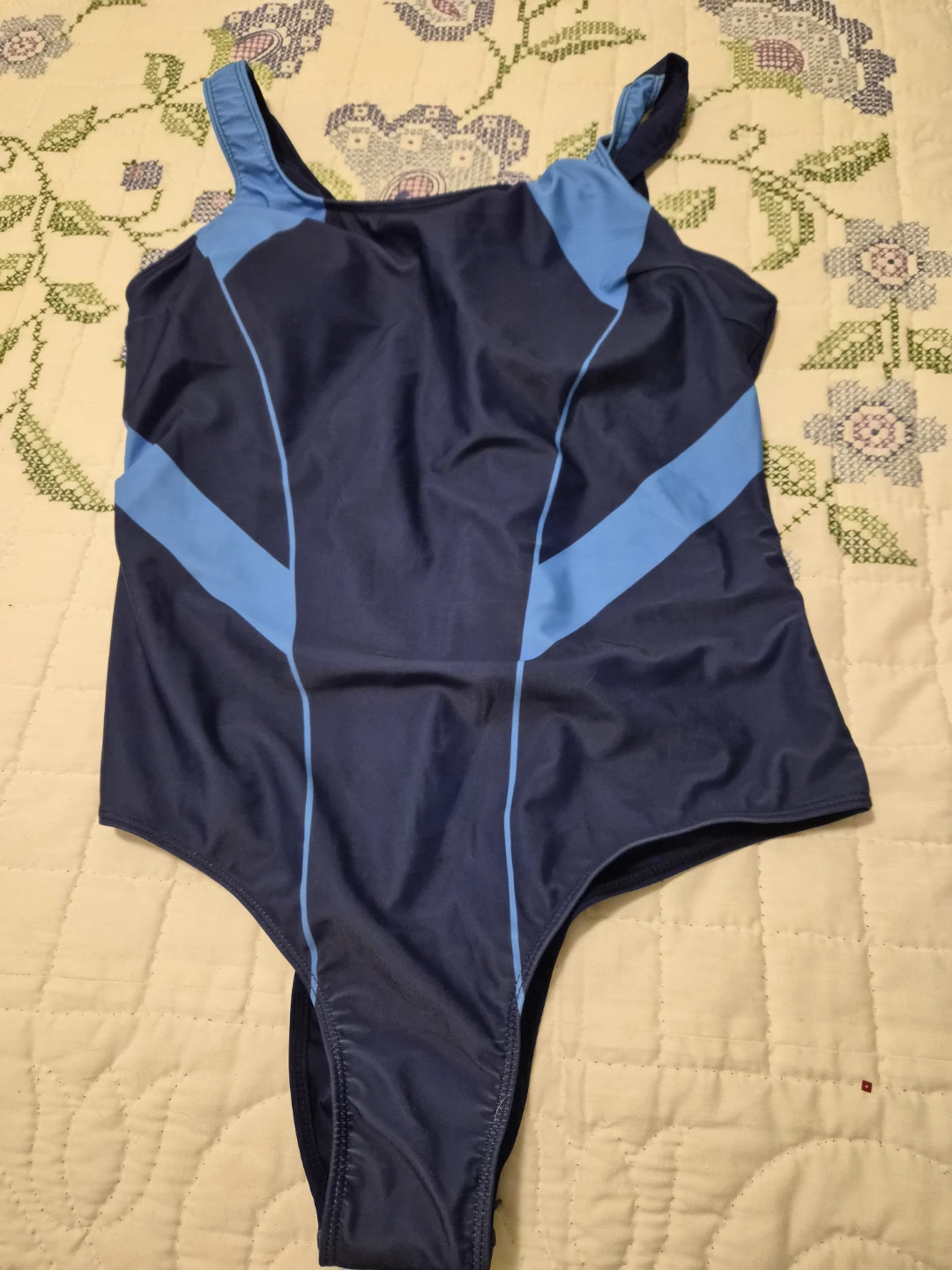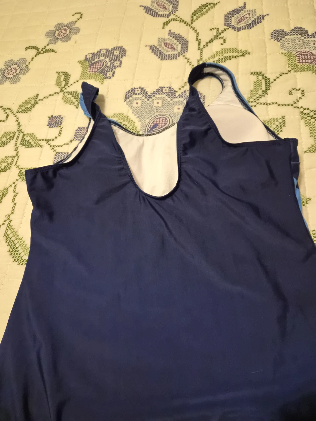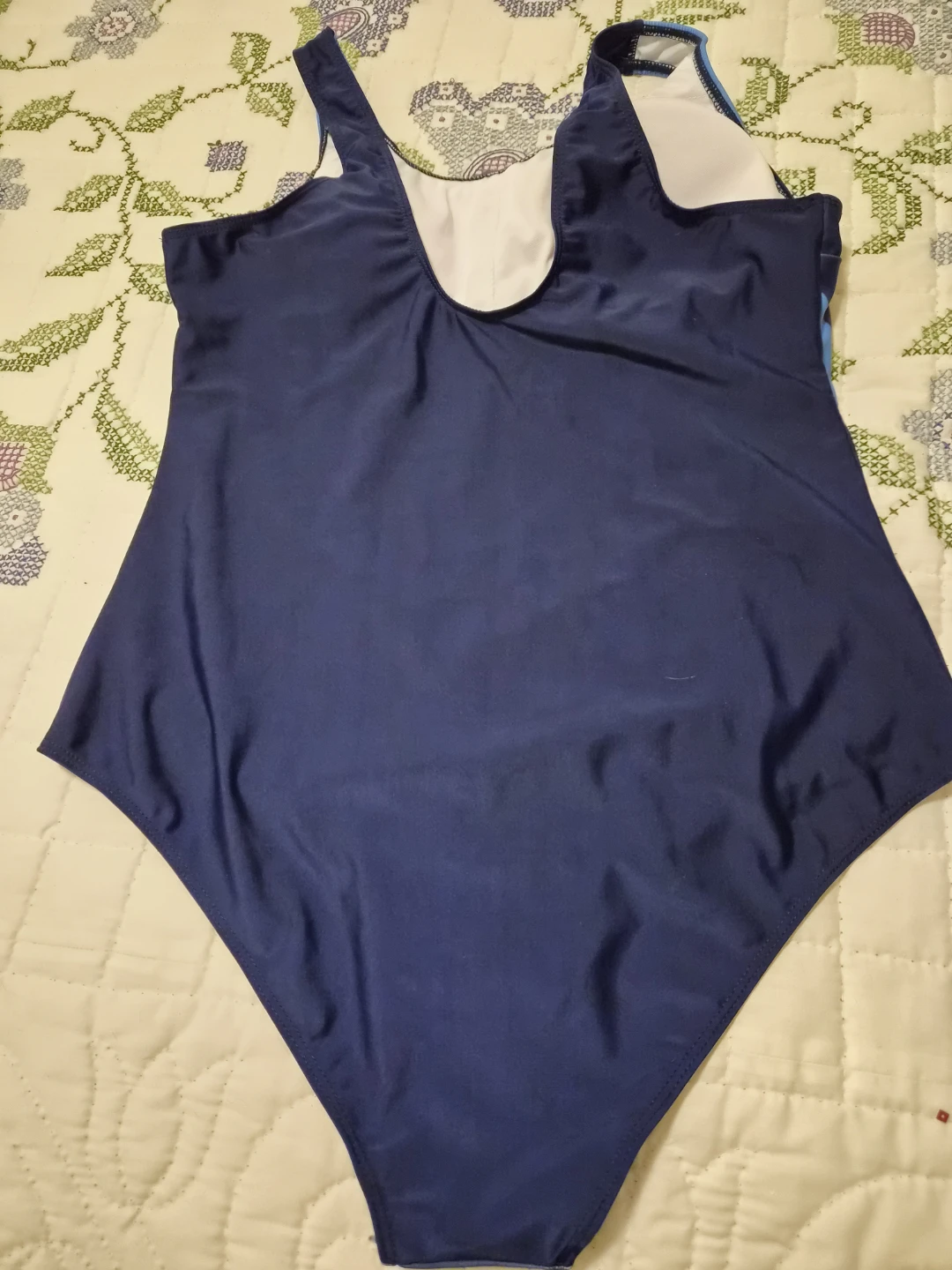 A classic navy blue one-piece swimsuit with contrasting light blue accents. It's made from a stretchy, quick-drying material. This suit is comfortable for swimming or lounging by the pool.