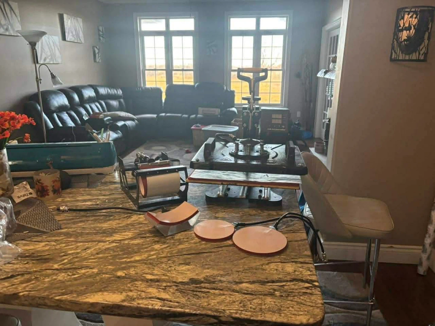 This bundle includes a teal Cricut Explore Air 2 cutting machine, a heat press, and various rolls of vinyl in different colours. It's perfect for crafters and small businesses looking to create custom designs on apparel, signs, and more. This is a great setup for anyone starting out in the custom vinyl or heat transfer business!