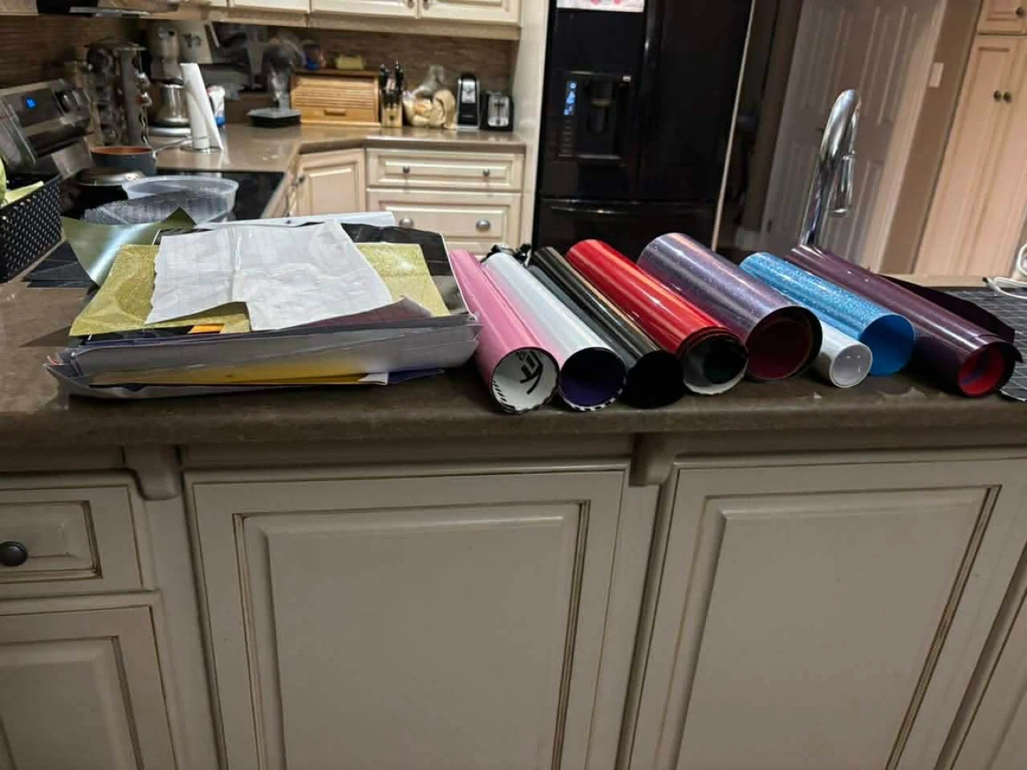 This bundle includes a teal Cricut Explore Air 2 cutting machine, a heat press, and various rolls of vinyl in different colours. It's perfect for crafters and small businesses looking to create custom designs on apparel, signs, and more. This is a great setup for anyone starting out in the custom vinyl or heat transfer business!