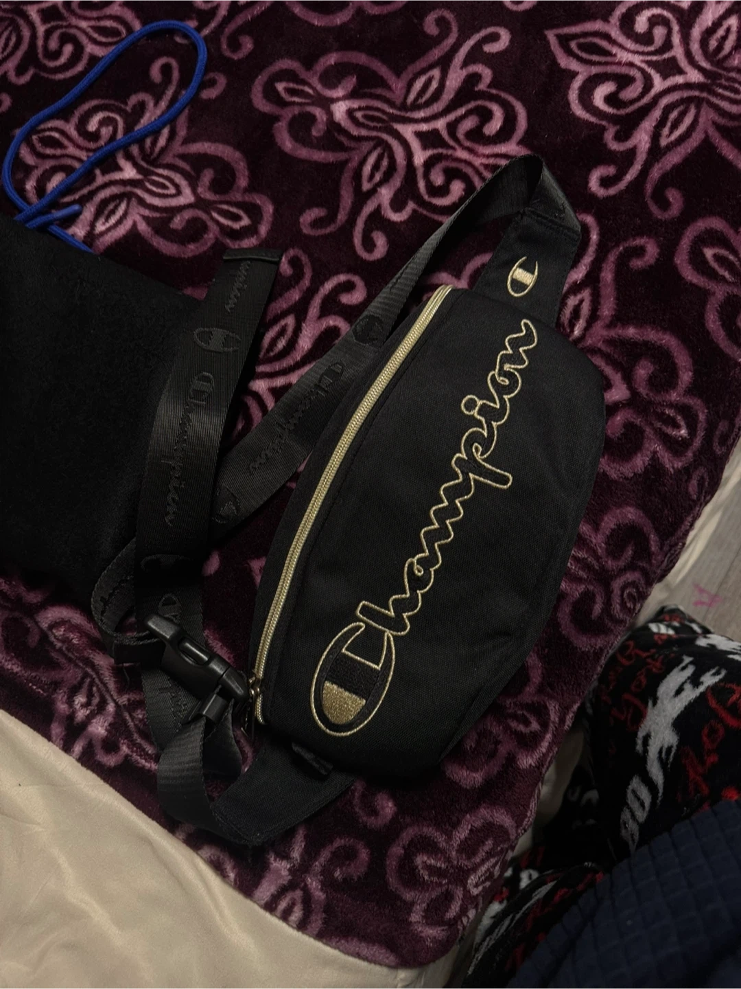 Black Champion fanny pack with a gold embroidered logo. It's made of durable fabric and features an adjustable strap with a buckle closure. A great bag for hands-free carrying!