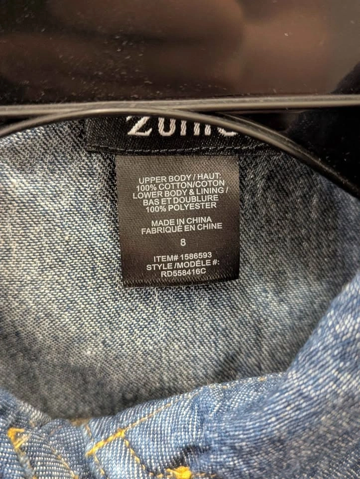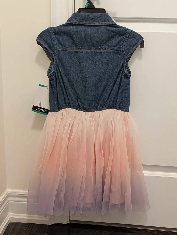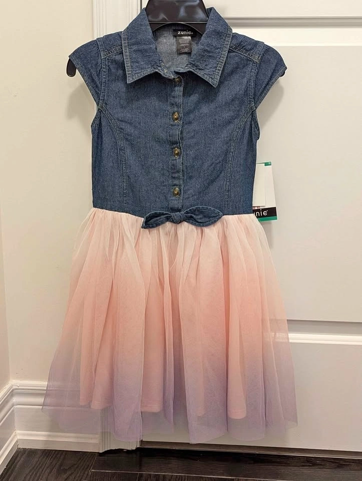 Cute Zunie dress for girls. Denim top has a collared button-down style with short sleeves. The skirt is a pretty pink and purple ombre tulle. Has a little denim bow detail at the waist. Size 8. Brand new with tags. Pickup in Nobleton.