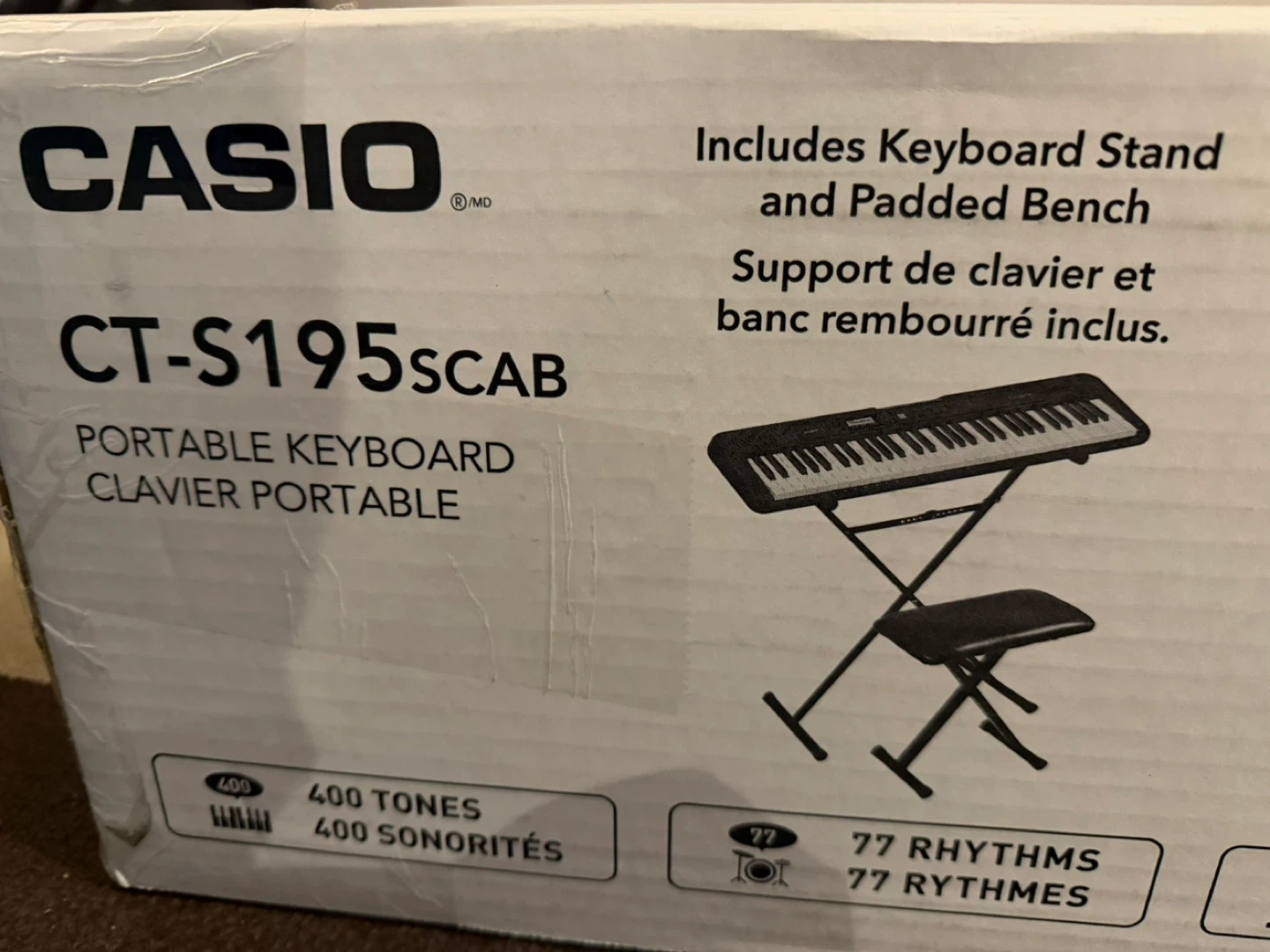 This Casio CT-S195 Casiotone portable keyboard comes with a keyboard stand and padded bench. It offers 400 tones and 77 rhythms.