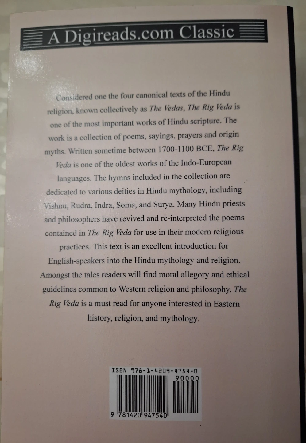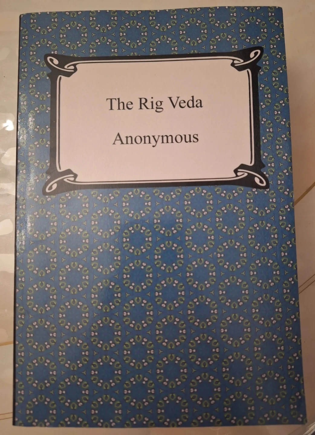 The Rig Veda is considered one of the four canonical texts of the Hindu religion. It's a collection of poems, sayings, prayers, and origin myths. This text is an excellent introduction for English-speakers into Hindu mythology and religion. 758 pages.