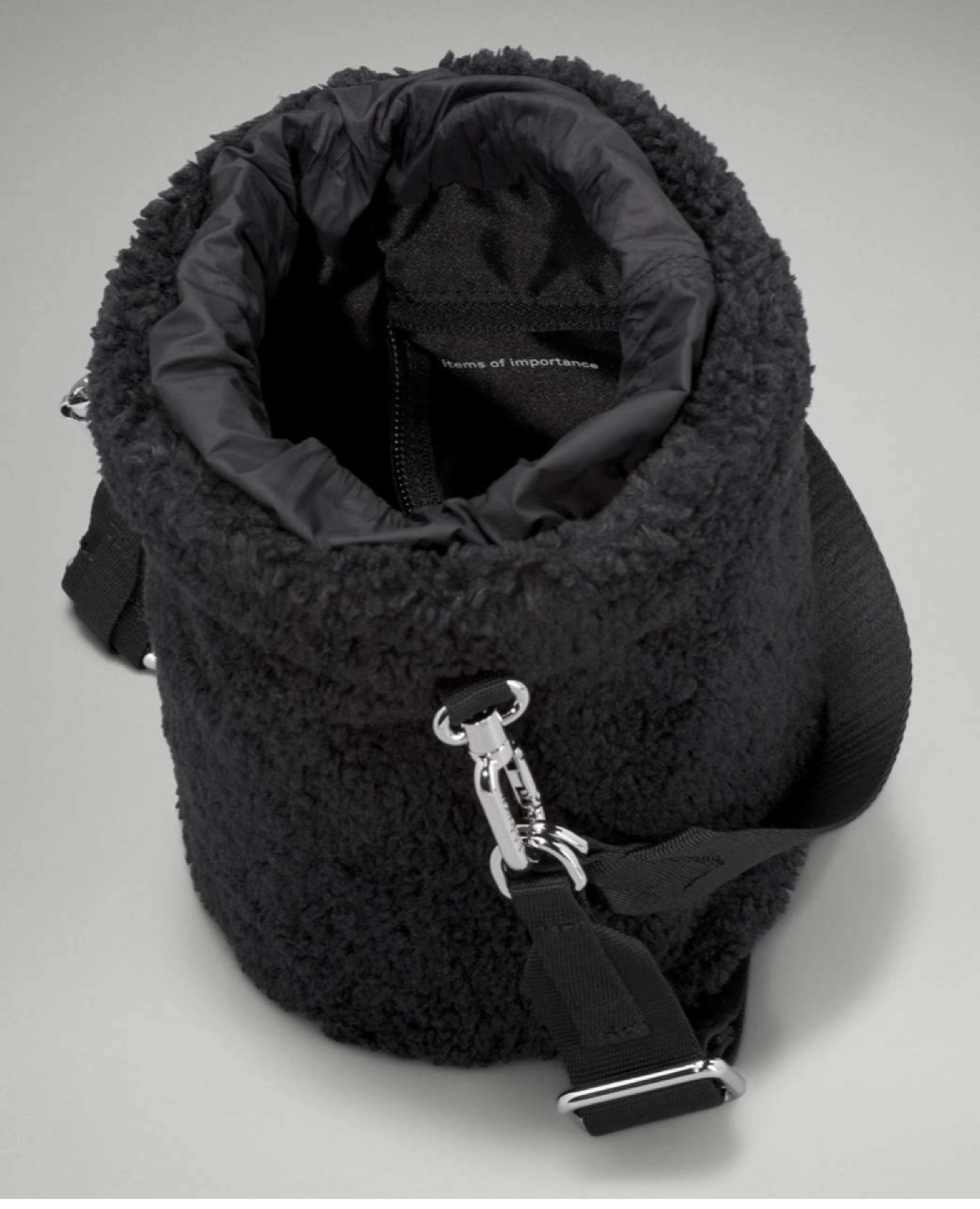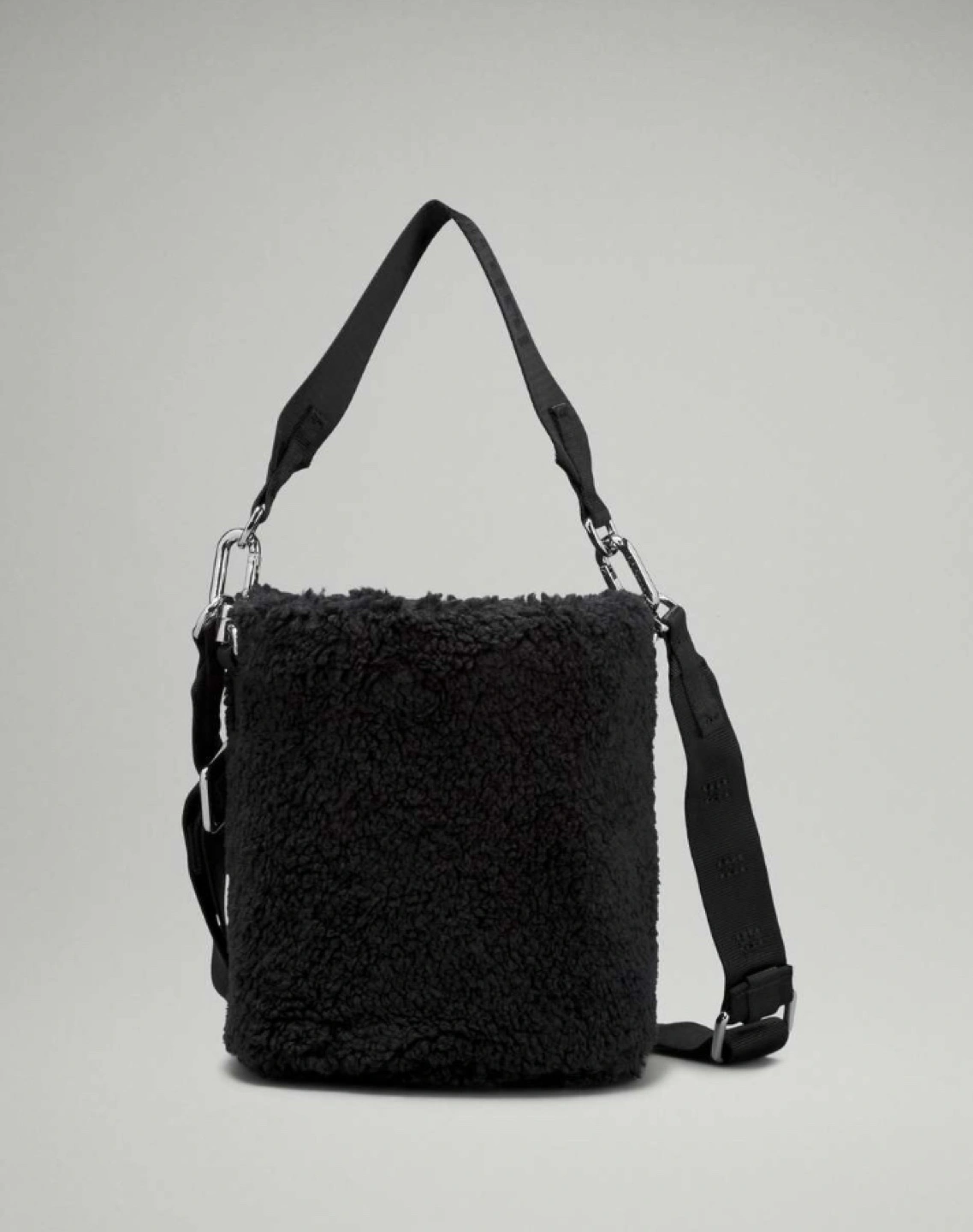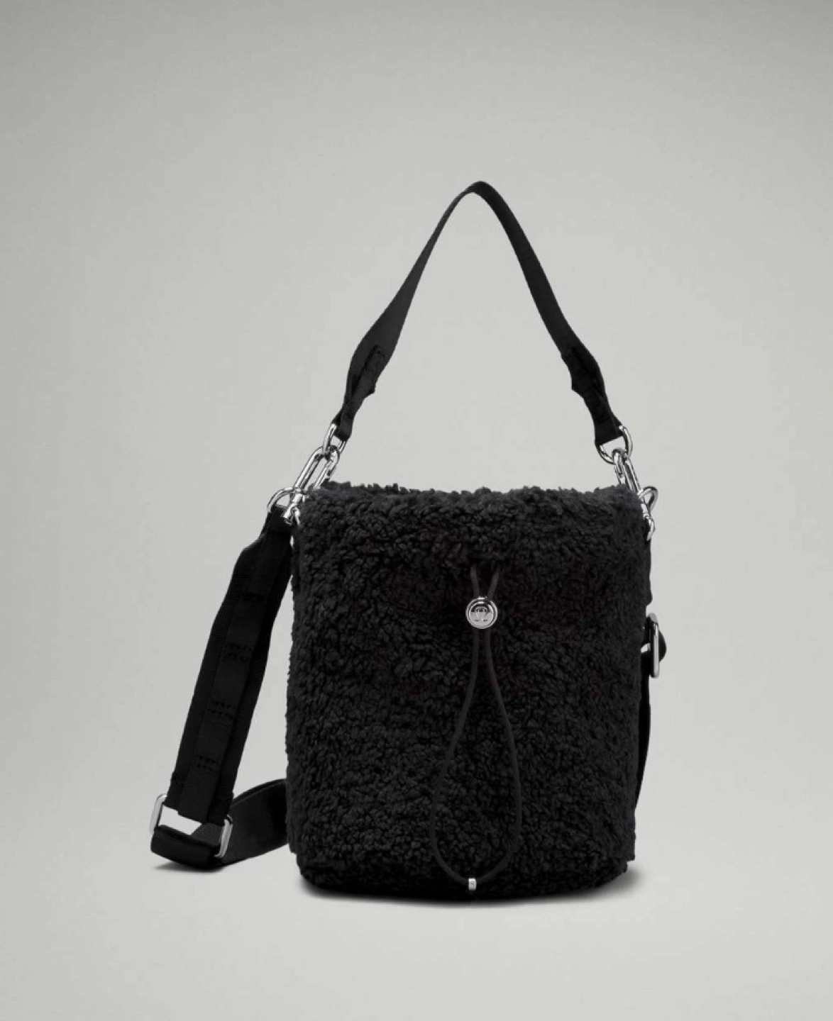 Adorable black sherpa bucket bag. Features a drawstring closure and adjustable strap. Perfect for everyday use.