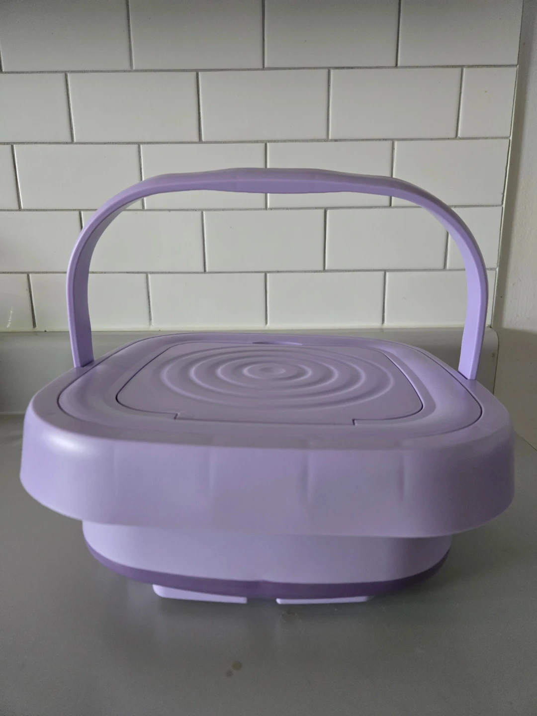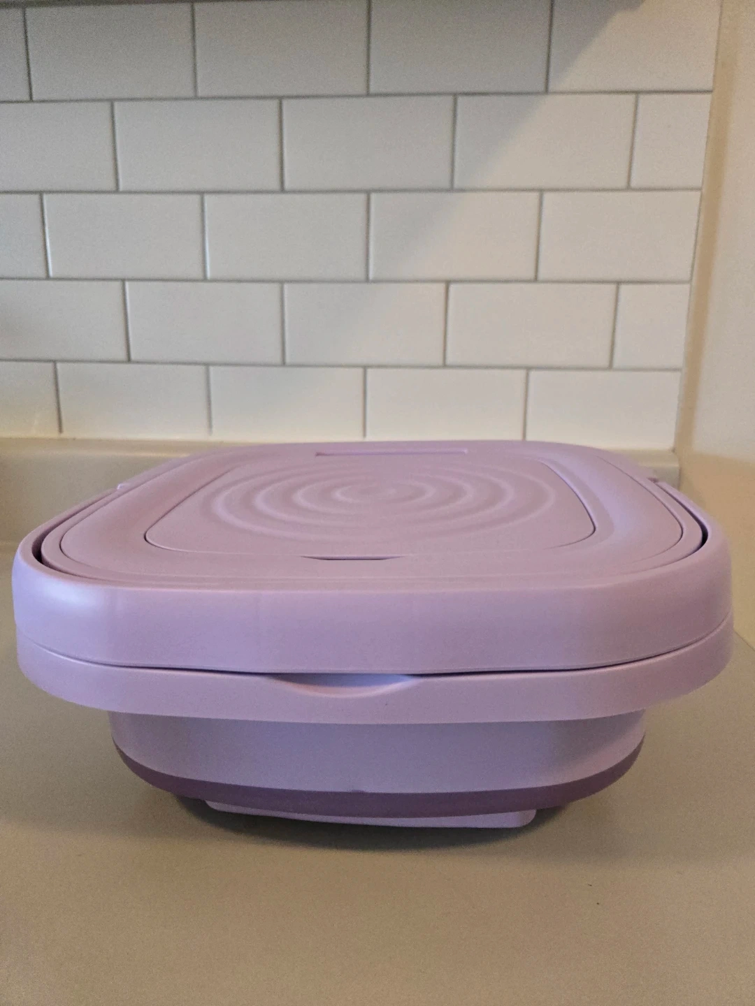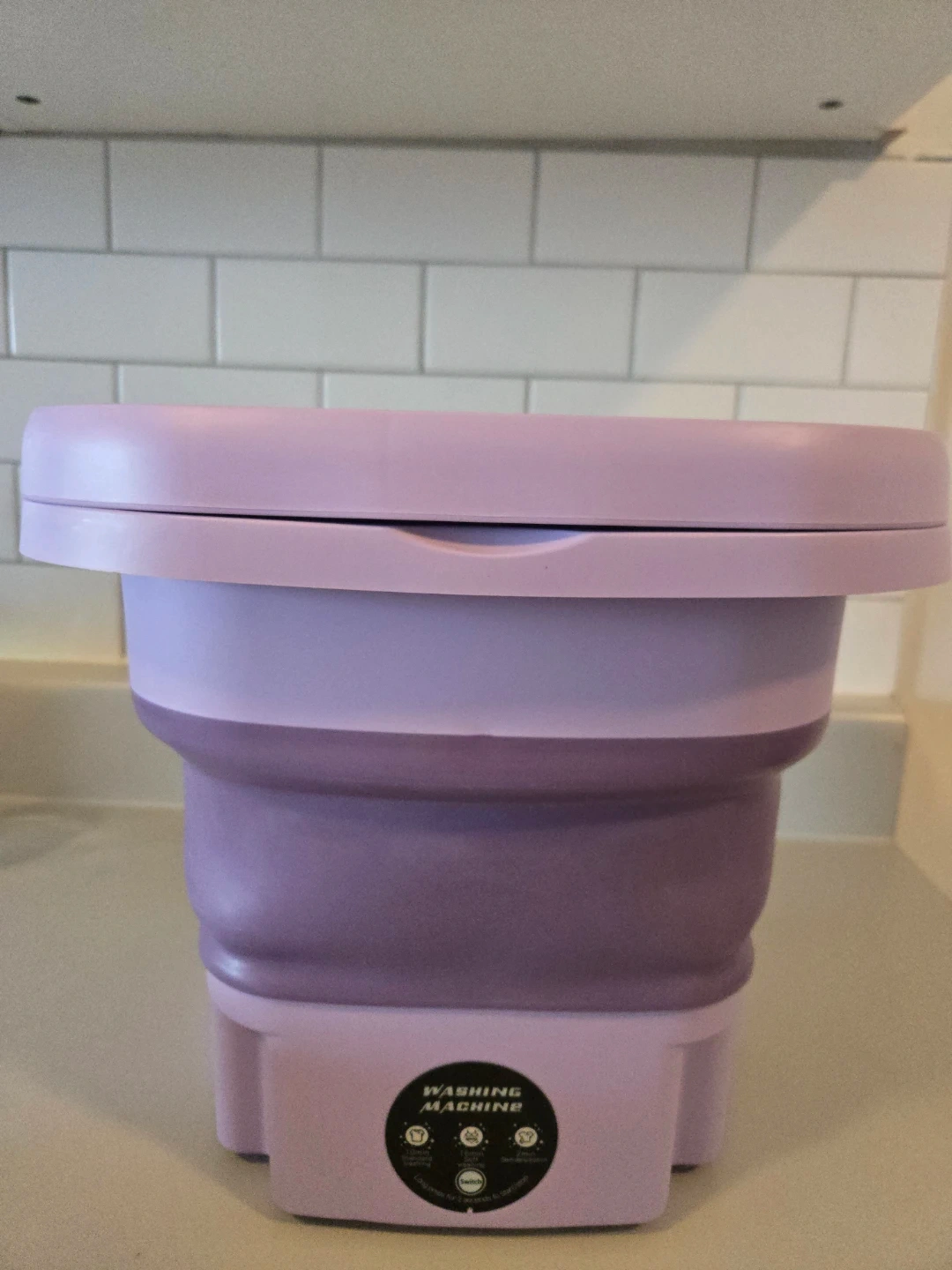 This portable washing machine is great for small loads. It has a 10-minute quick wash cycle. It also offers a 15-minute standard wash and a 2-minute spin dry function. It's collapsible for easy storage! Pickup only. No Refund