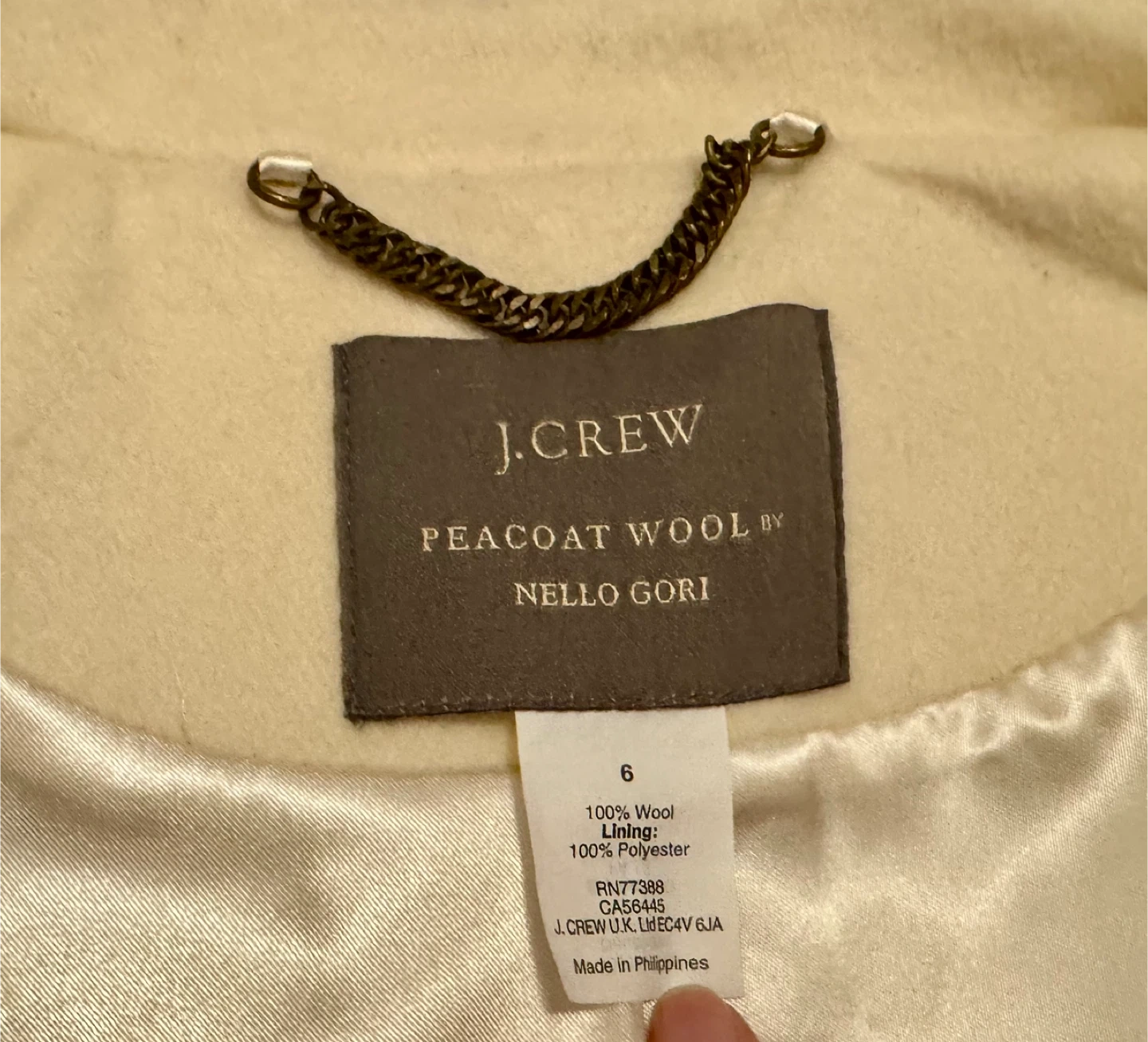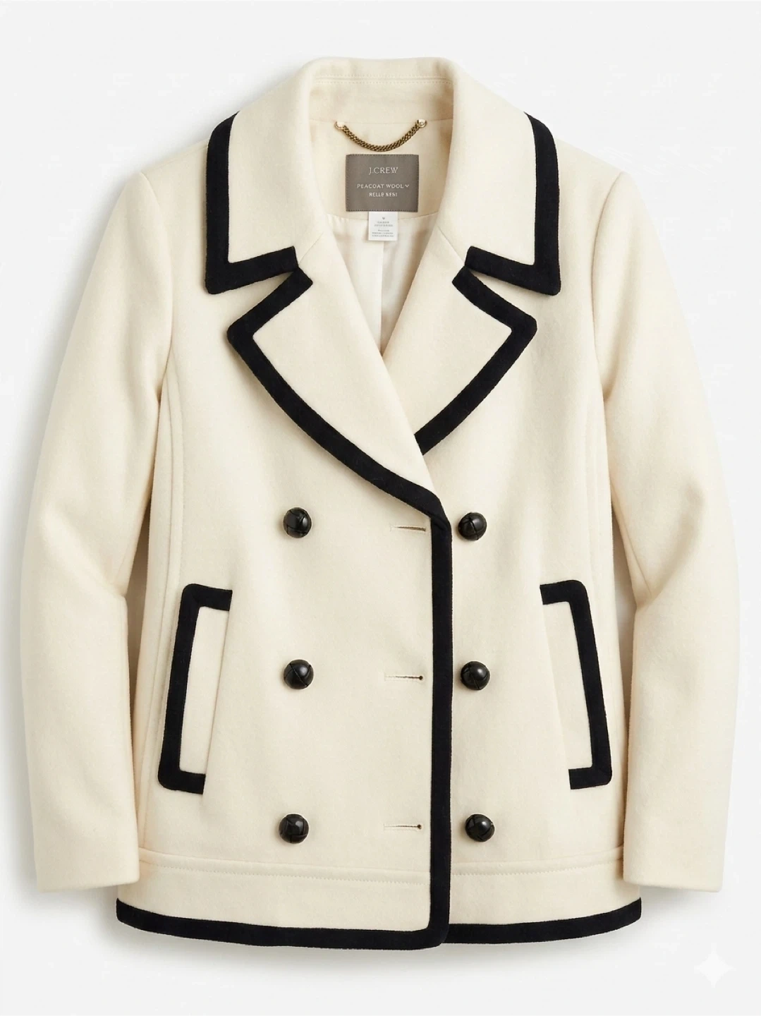 • Design: Classic cream/off-white wool blend featuring elegant black contrast piping and stylish leather-wrapped buttons.