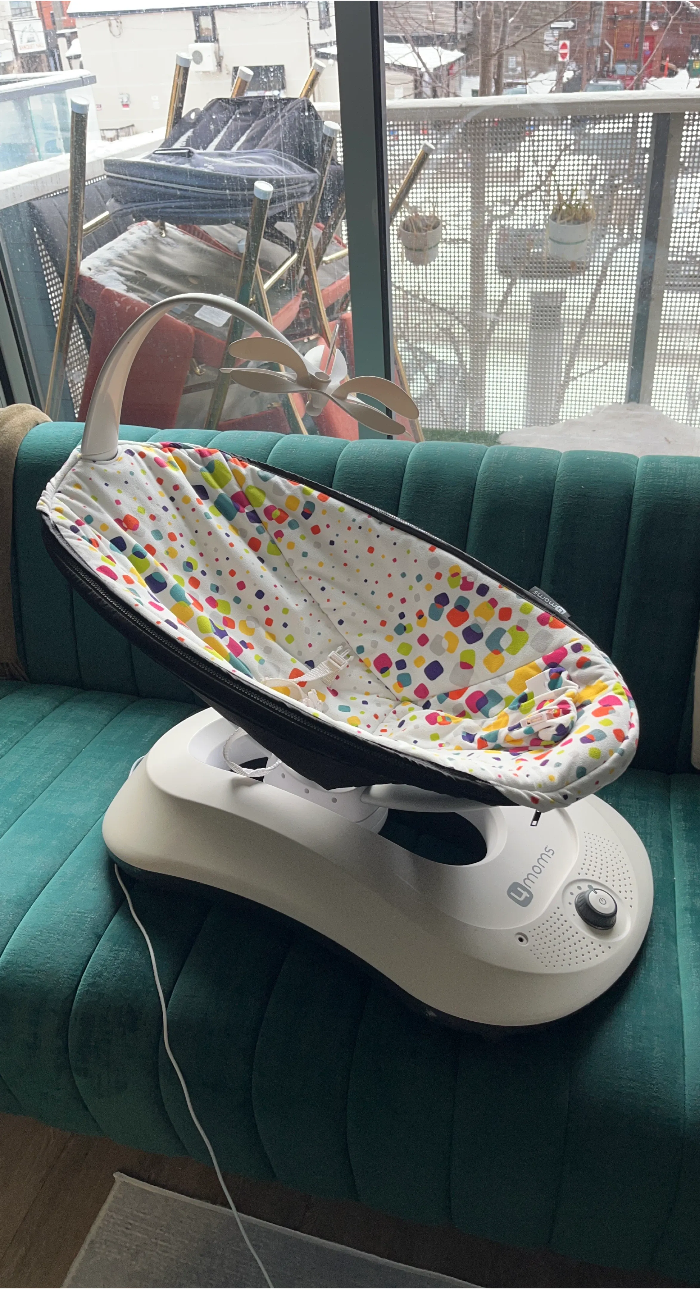 This 4moms rockaRoo infant seat features a colourful confetti print. It bounces like a ball and moves side to side. The seat fabric is removable for cleaning. It's perfect for keeping your little one entertained and comfortable.