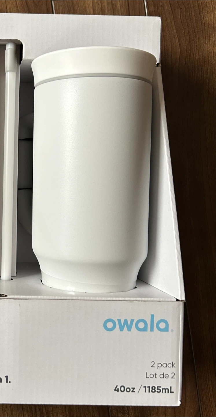 Brand new 1 Owala tumblers 40oz (1185mL) tumblers. They feature a 2-in-1 splash-resistant lid with a removable straw and triple-layer insulation. The tumblers also have an easy-to-grip handle.