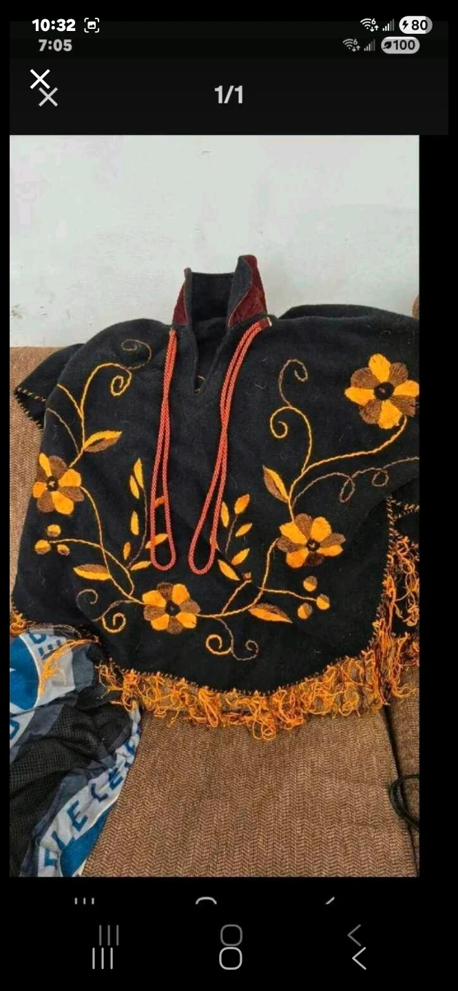 Embroidered Black Poncho with Orange Floral Design