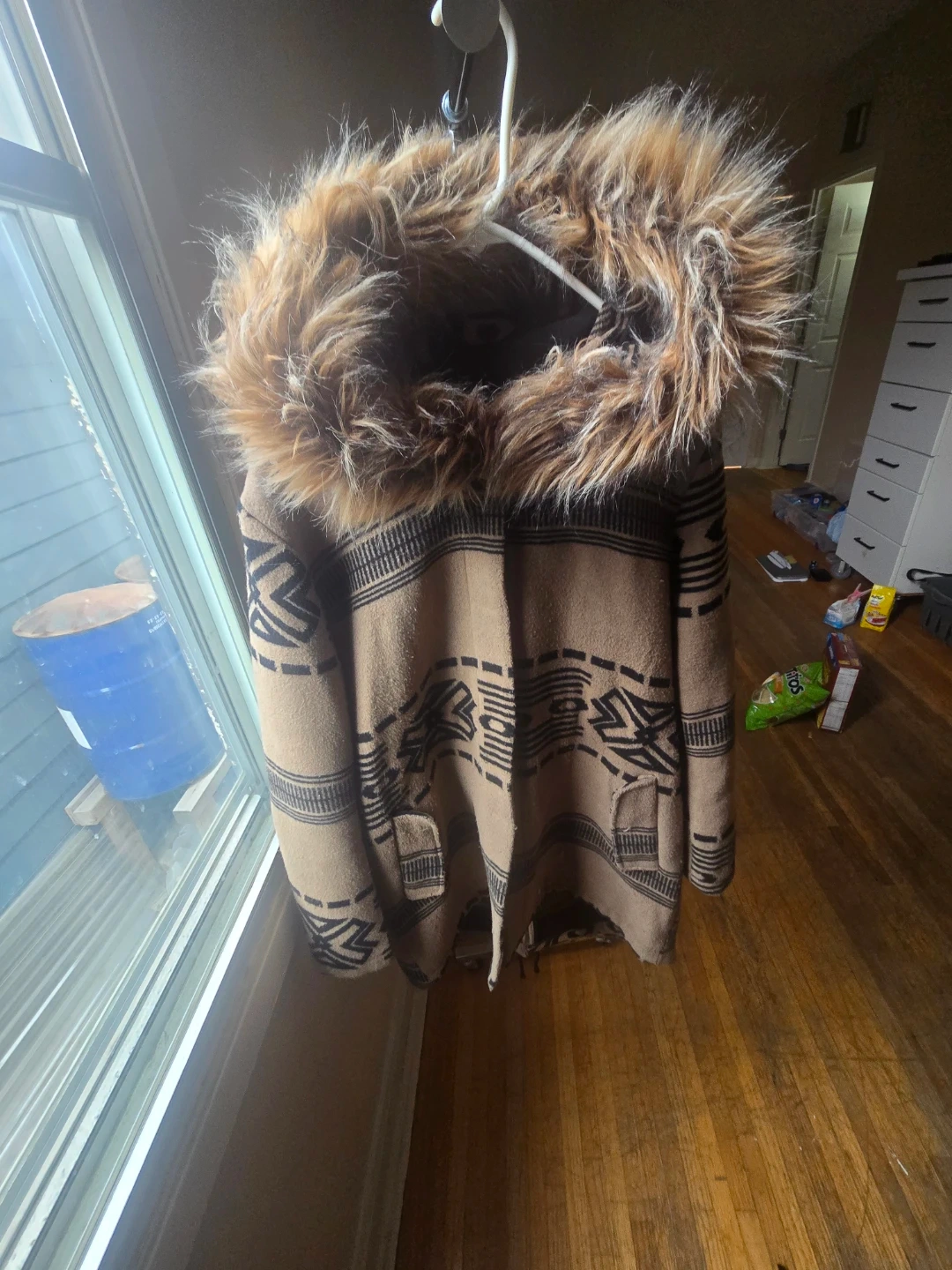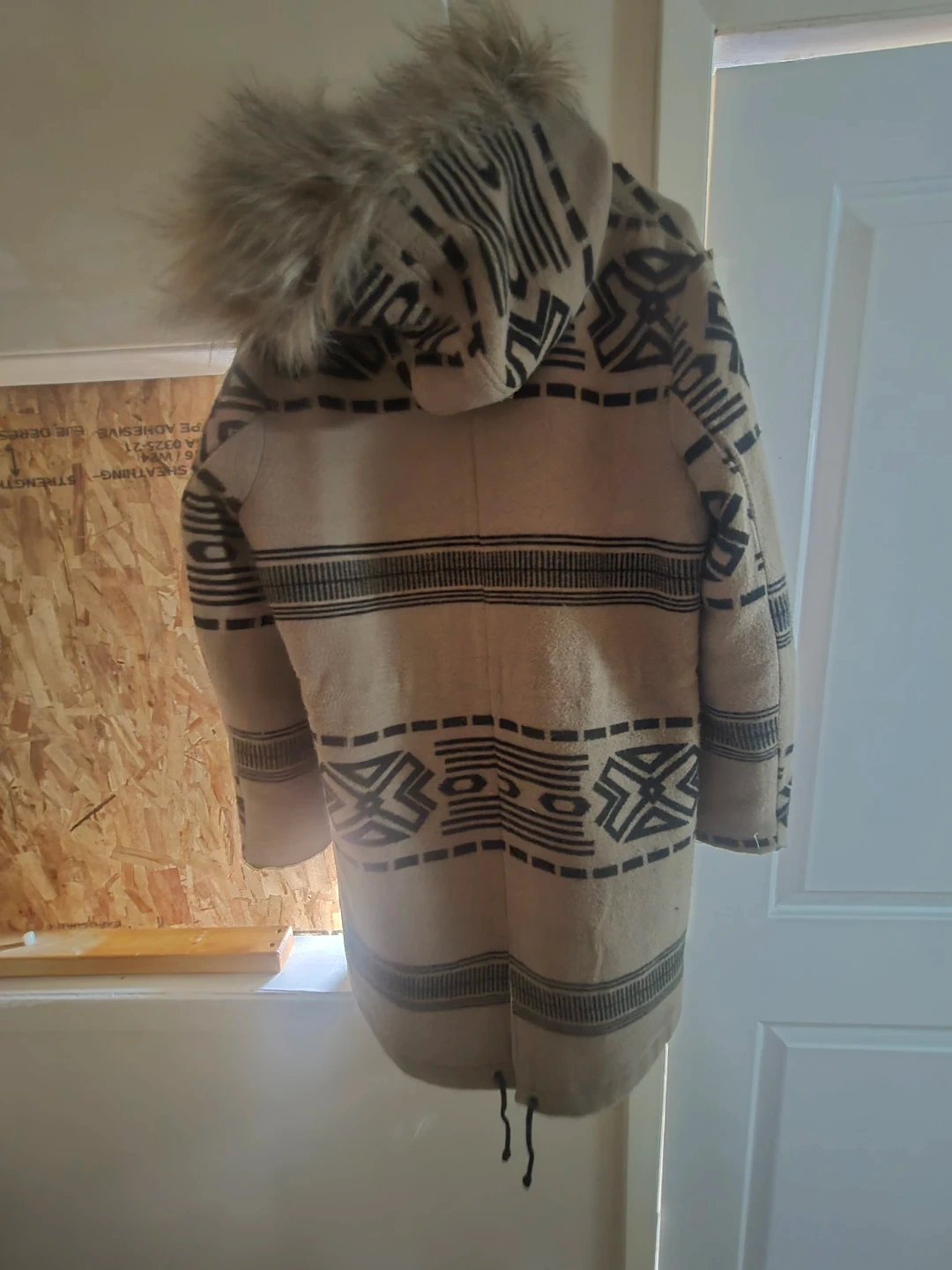 This men's parka features a bold geometric pattern in black and tan. It has a cozy faux fur-lined hood and a drawstring waist for a better fit. A great jacket for chilly weather!