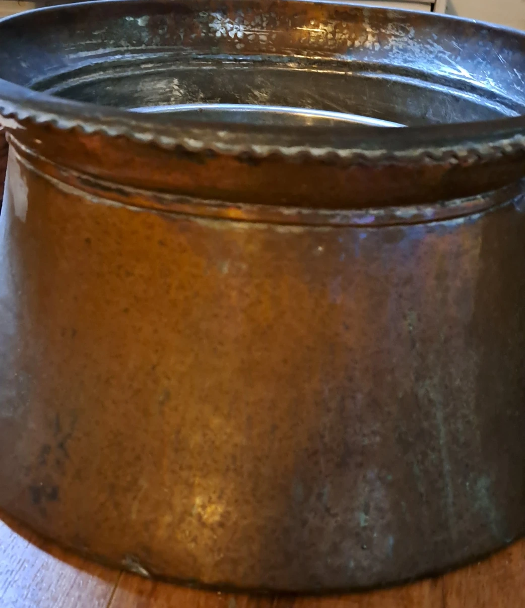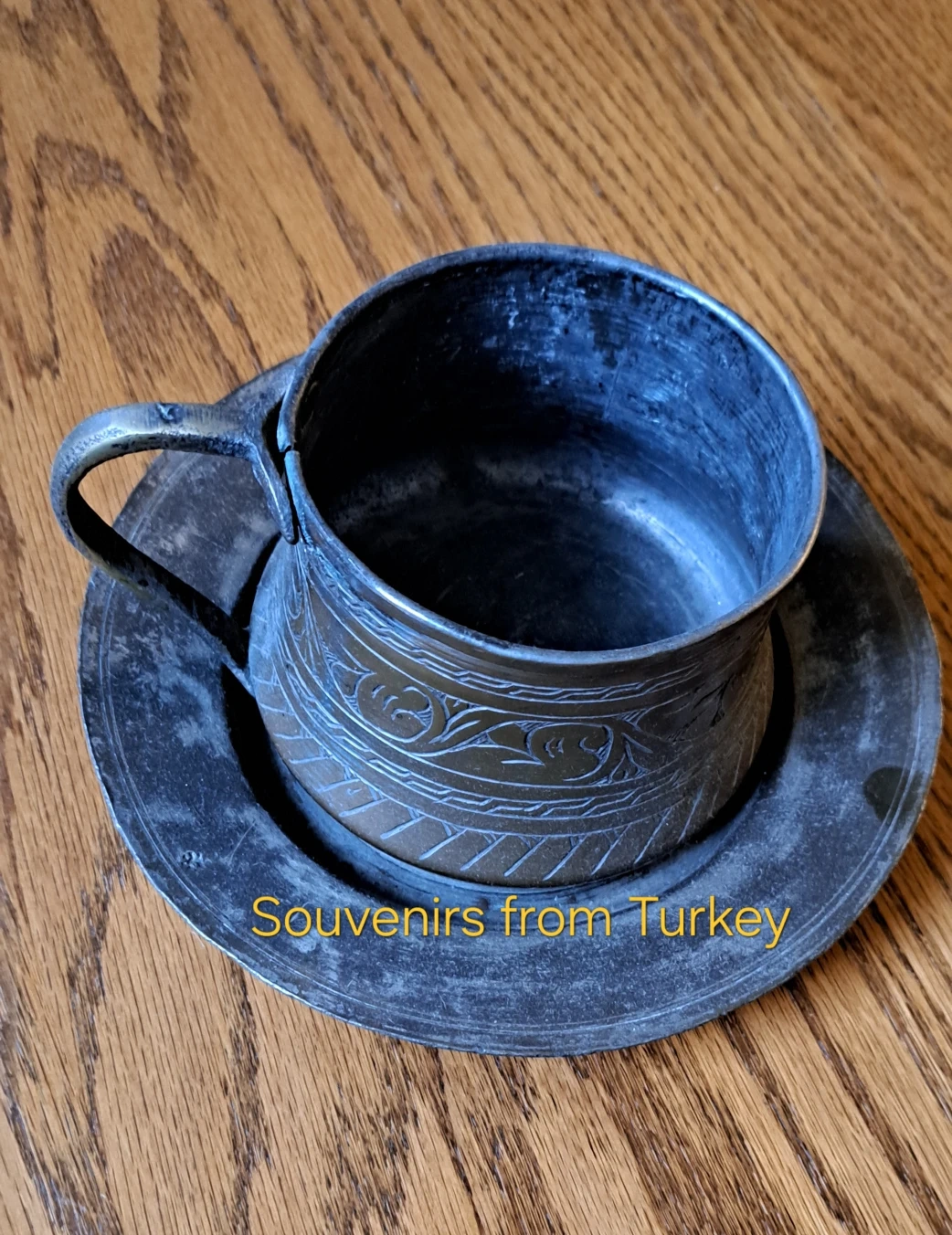 Selling a vintage copper cup and saucer set, possibly a souvenir from Turkey! The set has a unique design and patina, showing its age and history. It would make a lovely decorative piece or addition to a collection