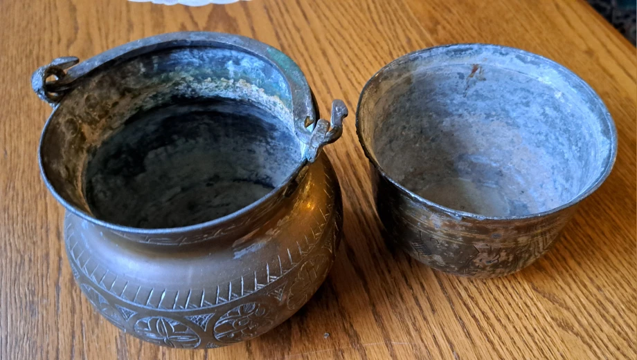 Selling a vintage copper cup and saucer set, possibly a souvenir from Turkey! The set has a unique design and patina, showing its age and history. It would make a lovely decorative piece or addition to a collection