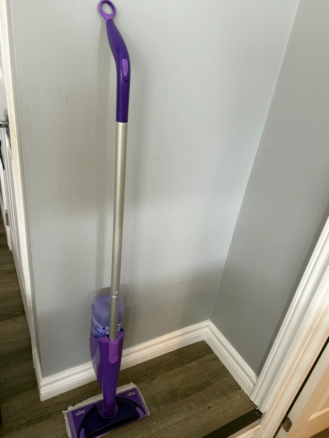 Selling a Swiffer WetJet mop in purple! It's in great condition and ready to help keep your floors clean. Perfect for quick and easy cleanups.. full cleaning solution jug, just doesn’t come with pads