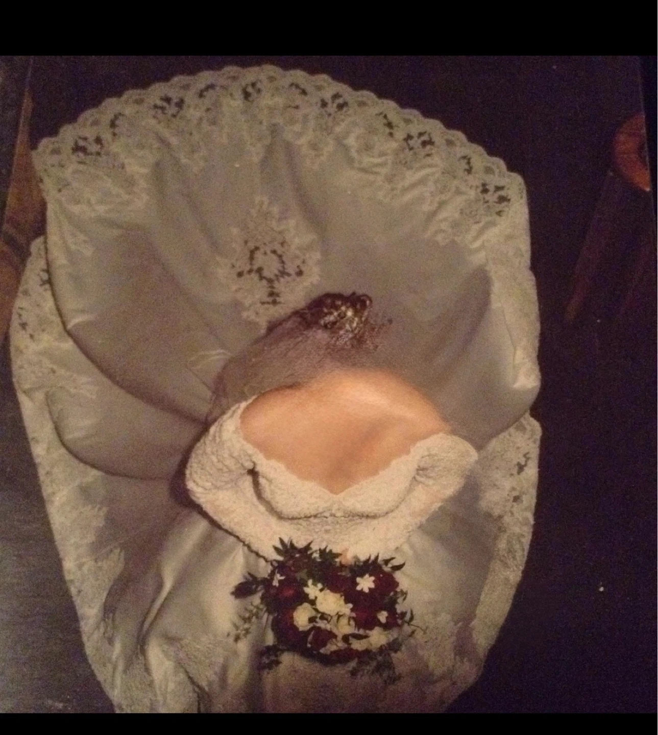 Beautiful white wedding dress featuring long sleeves adorned with intricate lace. The bodice has a V-neckline and a button-up back closure. Includes a matching veil. Perfect for your special day!