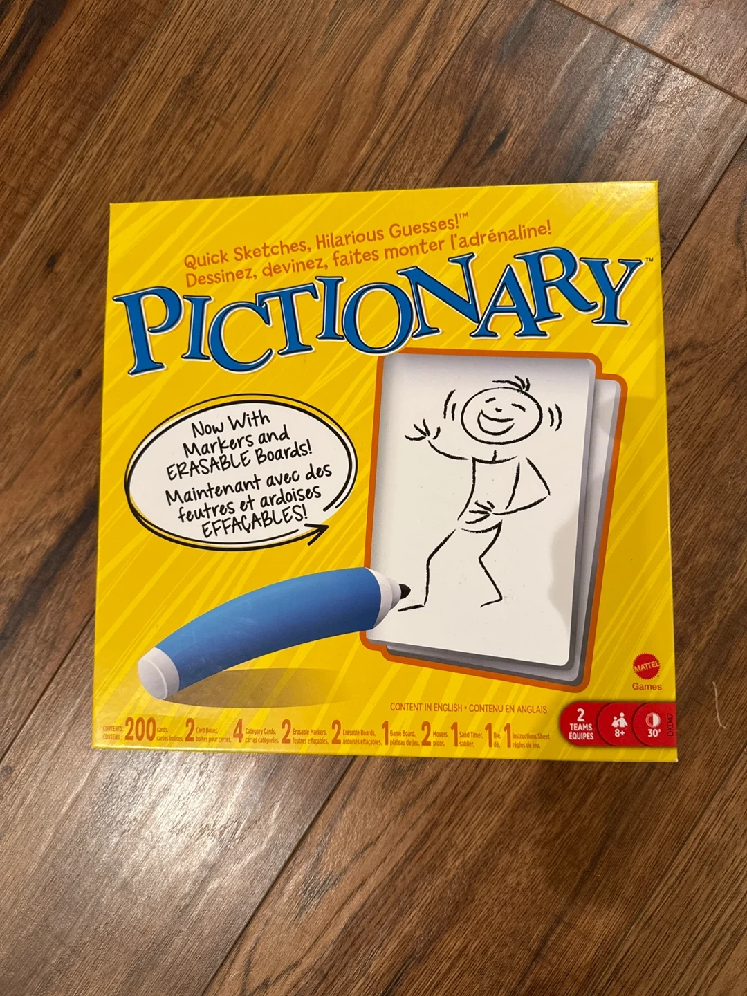 Selling a Pictionary board game! It's all about quick sketches and hilarious guesses. This game includes 200 category cards, 4 category cards, 2 erasable markers, 2 erasable boards, 1 sand timer, and 1 instruction sheet. Perfect for family game nights or gatherings with friends!