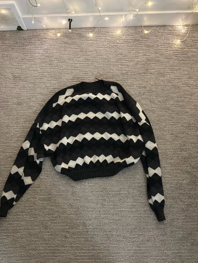 This is a used sweater with a black and white geometric pattern, perfect for adding a stylish layer to any outfit. It's in good condition, ready to bring a trendy touch to your wardrobe. I like to think this sweater has stories to tell, perhaps from cozy nights in or stylish outings. It is ready for a new chapter with you! If the ad is up, it's available!