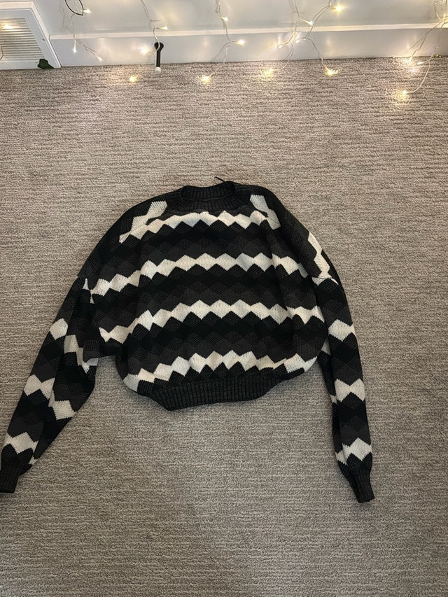 This is a used sweater with a black and white geometric pattern, perfect for adding a stylish layer to any outfit. It's in good condition, ready to bring a trendy touch to your wardrobe. I like to think this sweater has stories to tell, perhaps from cozy nights in or stylish outings. It is ready for a new chapter with you! If the ad is up, it's available!
