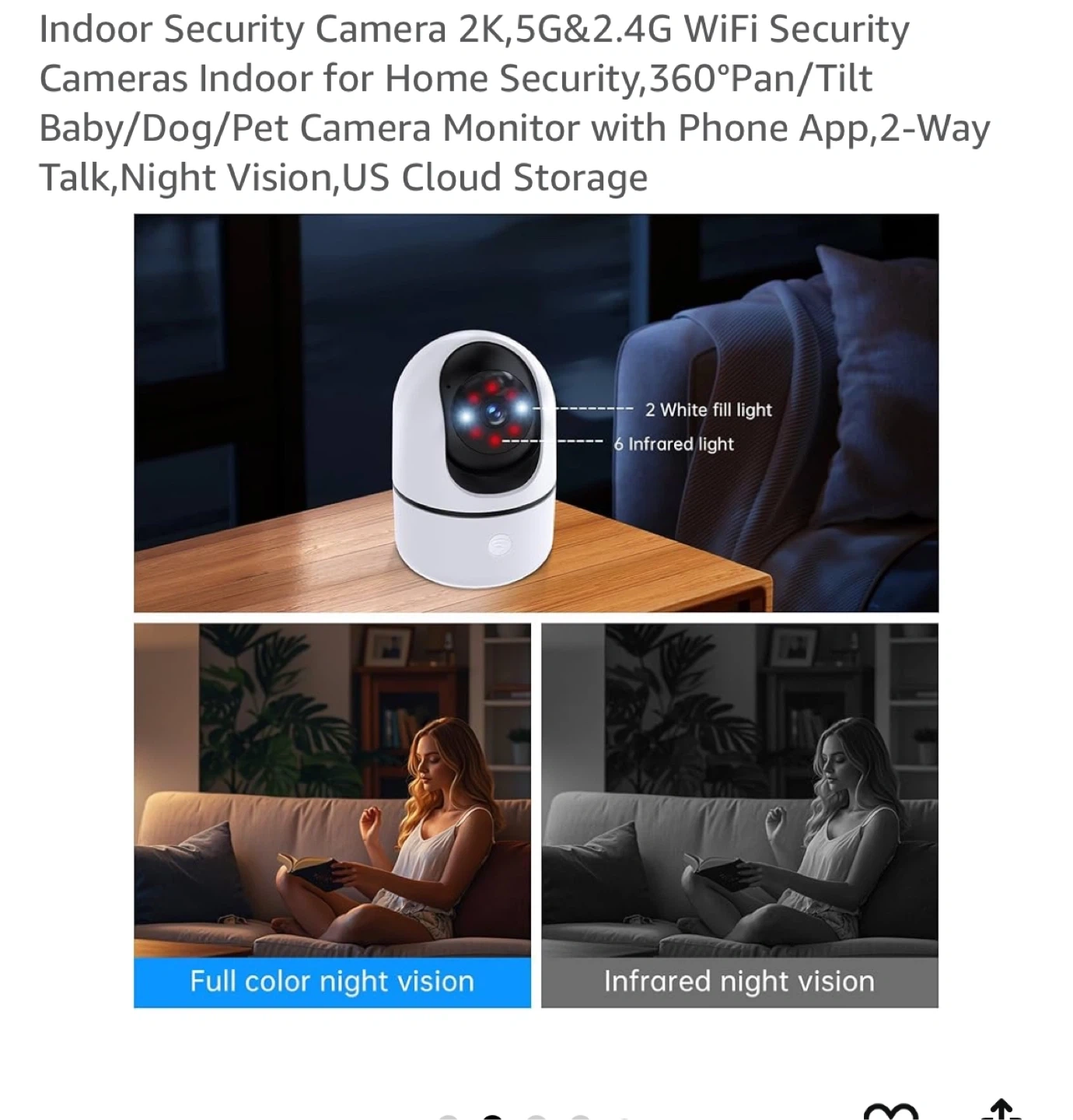 This is an AI Bulb camera with 2K resolution. It offers 360° pan/tilt, WiFi connectivity, and supports both 5G and 2.4G bands. It includes night vision and two-way talk capabilities. This camera is suitable for home security, baby monitoring, or pet surveillance.