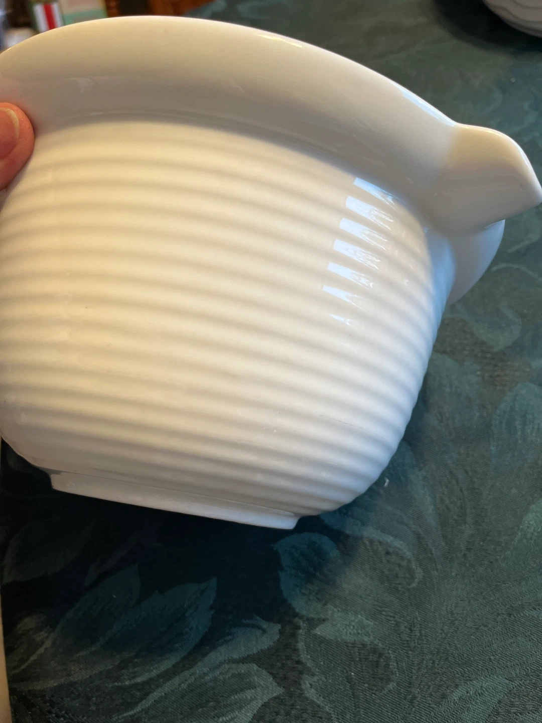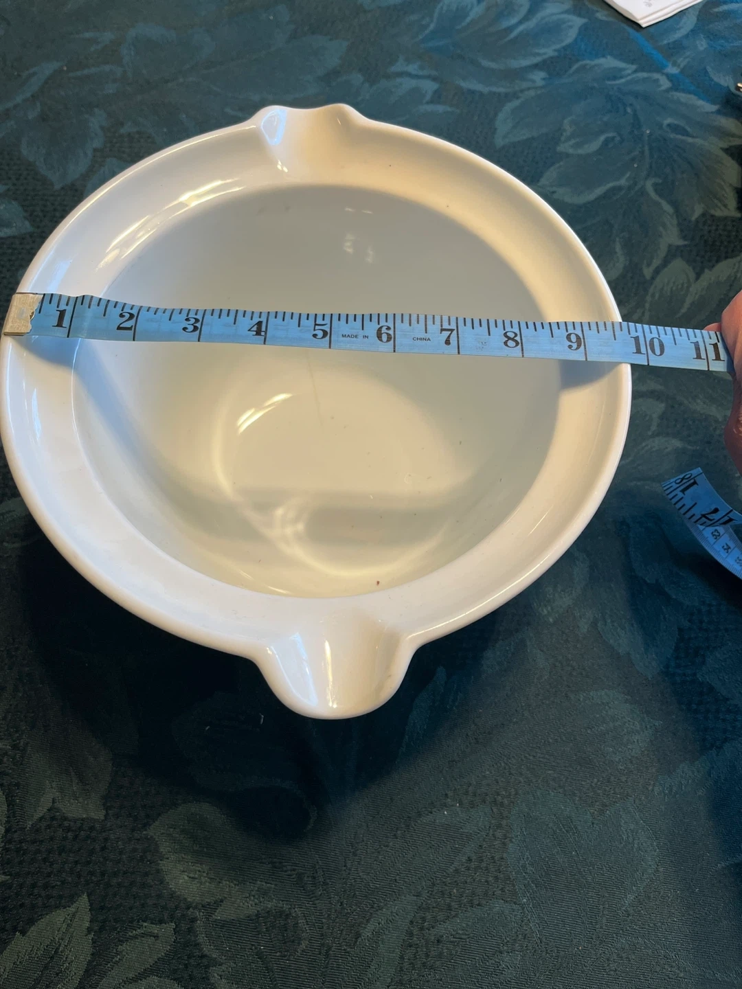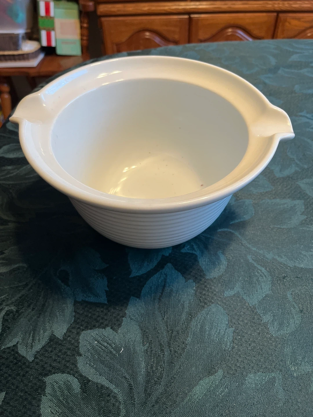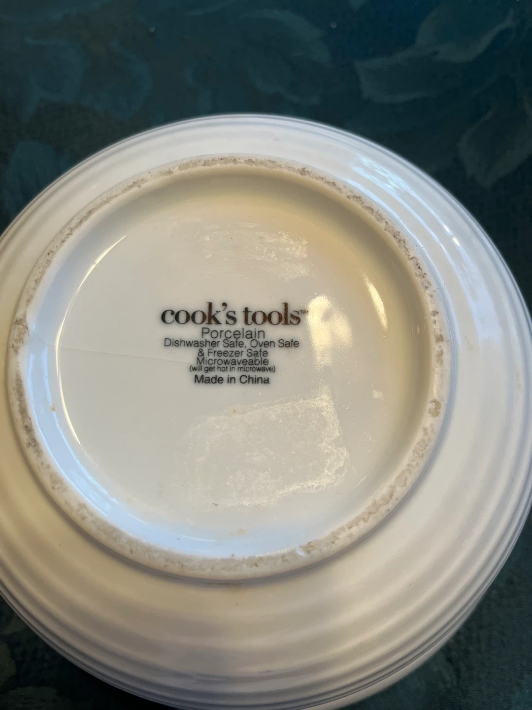This white porcelain mixing bowl from Cook's Tools is dishwasher, oven, and microwave safe. It's made in China. Its ribbed exterior and handles make it easy to use. Measures approximately 10 inches across.