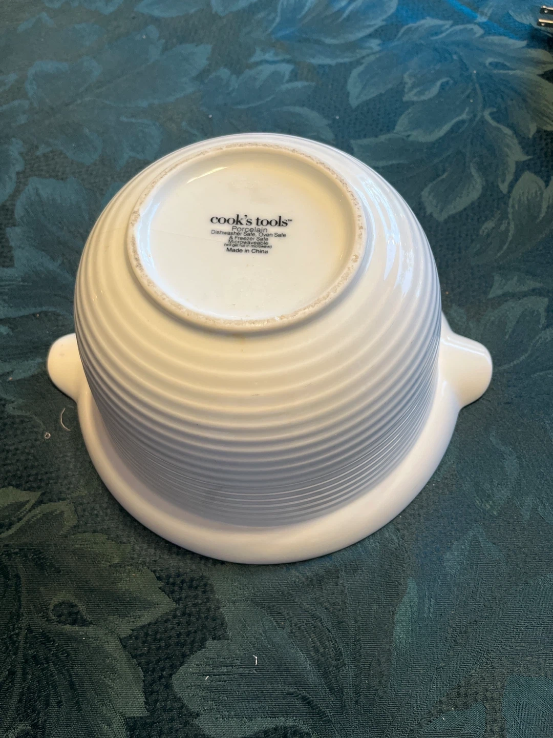 This white porcelain mixing bowl from Cook's Tools is dishwasher, oven, and microwave safe. It's made in China. Its ribbed exterior and handles make it easy to use. Measures approximately 10 inches across.