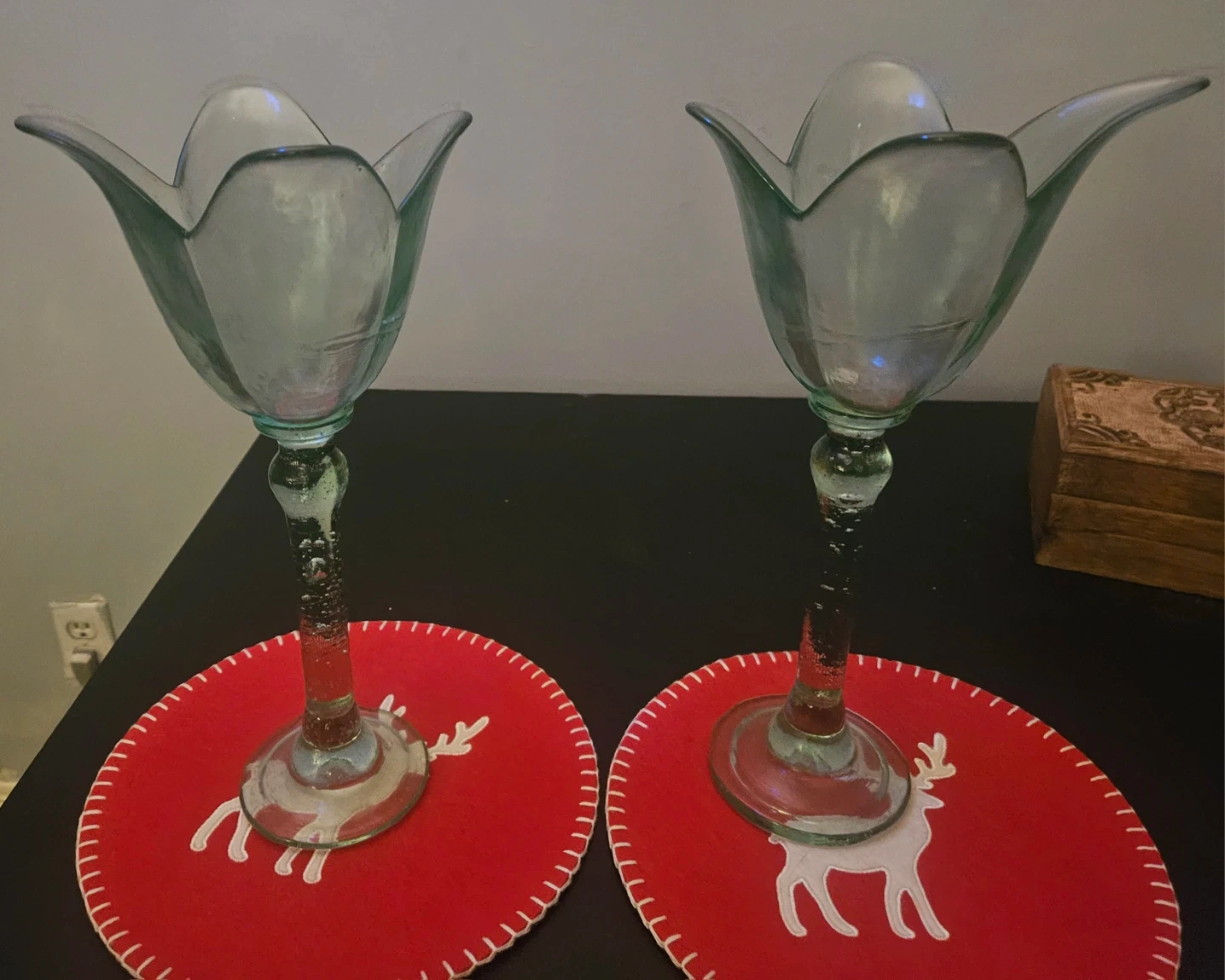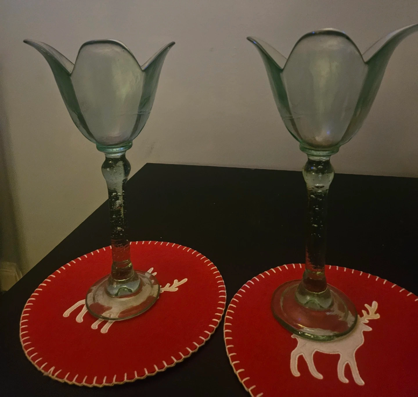 Set of 2 Green Blown Glass Tulip Bud Vases