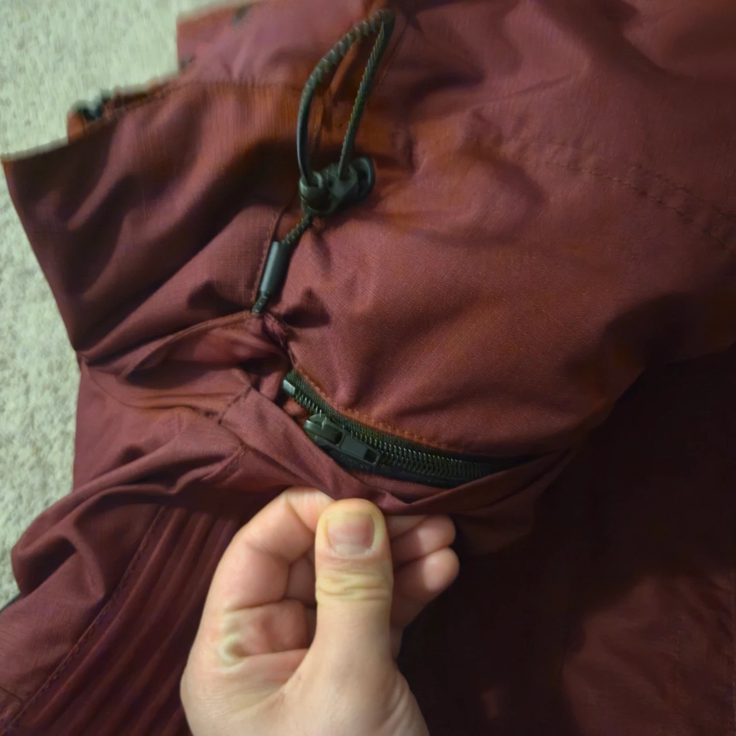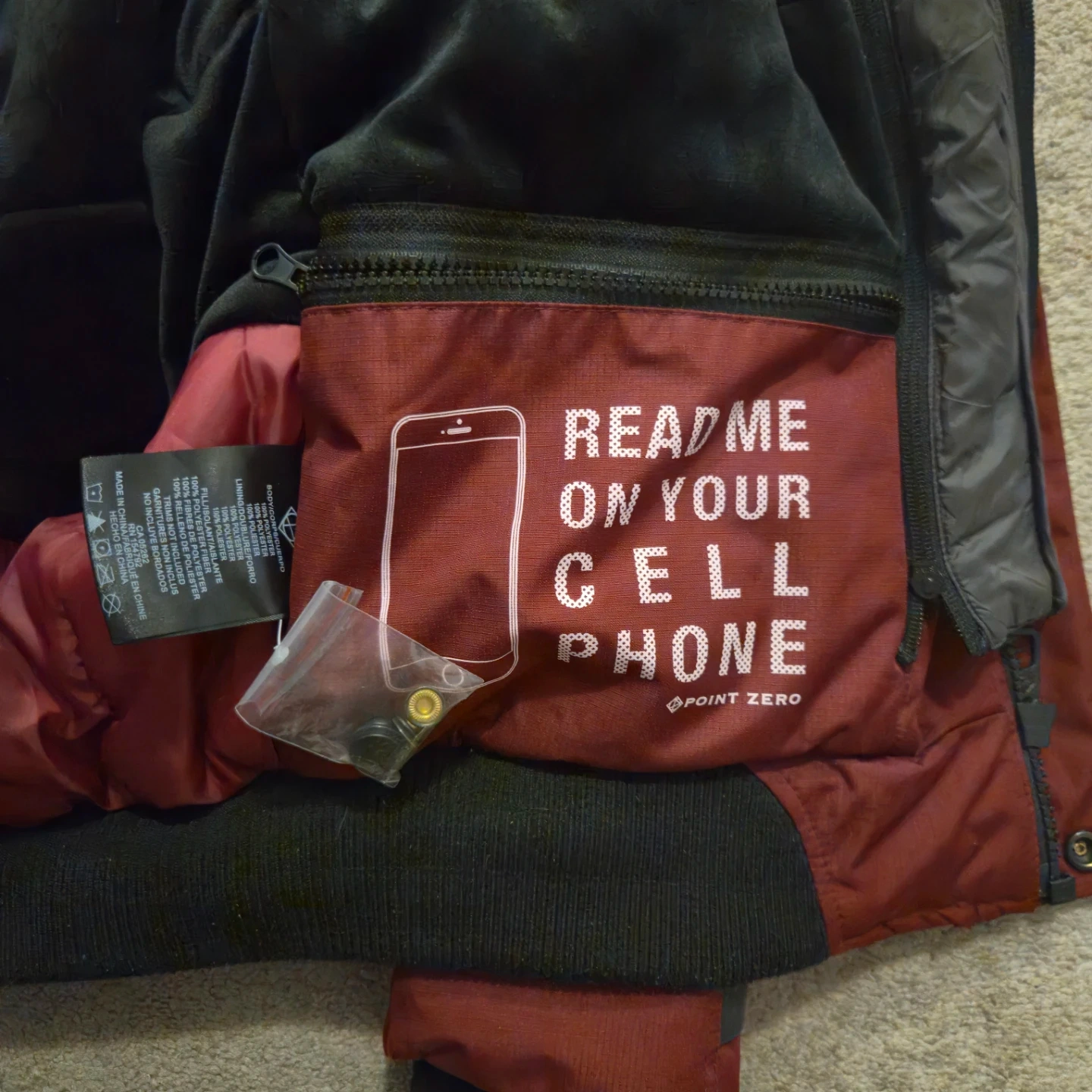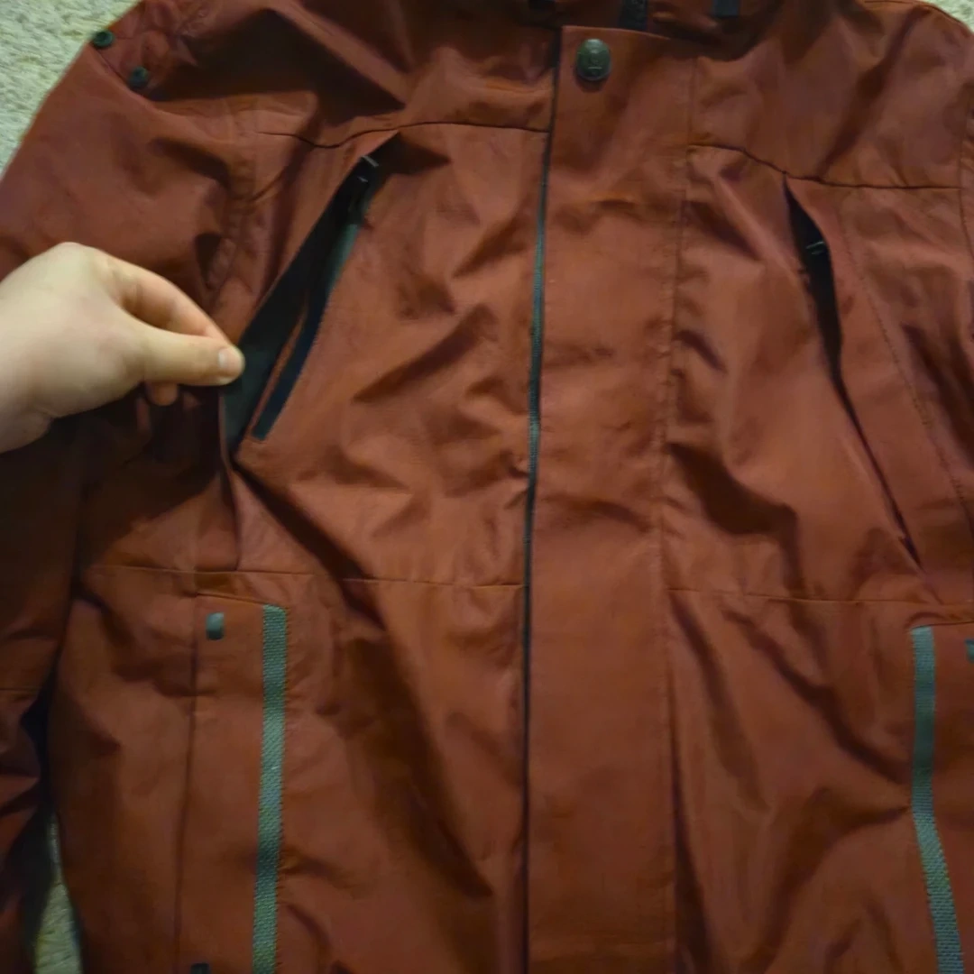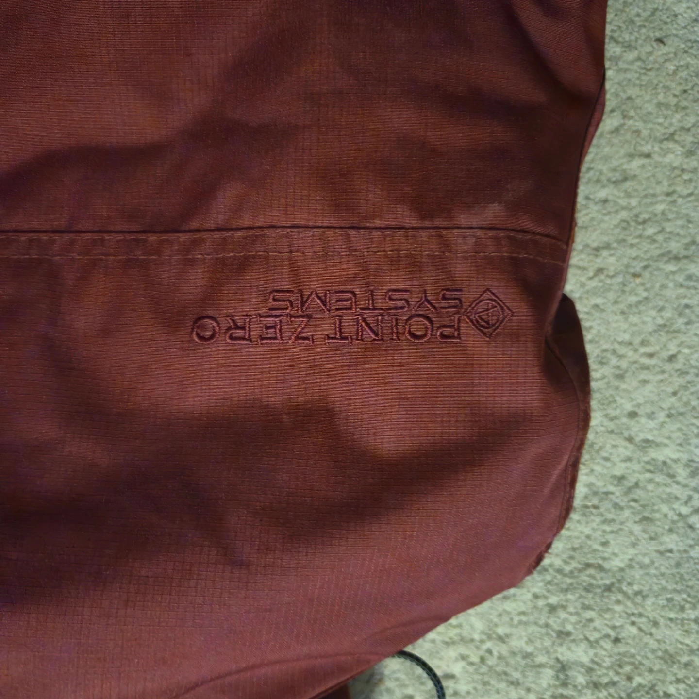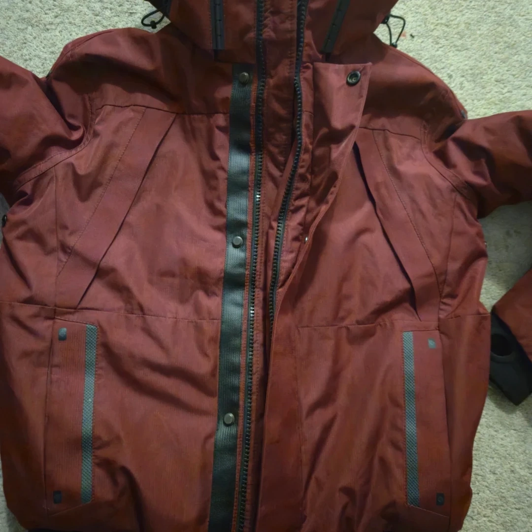 Point Zero ski jacket in a deep burgundy red, warm as hell and basically untouched. Hood snaps off, front zip adjusts, and the pockets are everywhere like they were trying to impress someone.