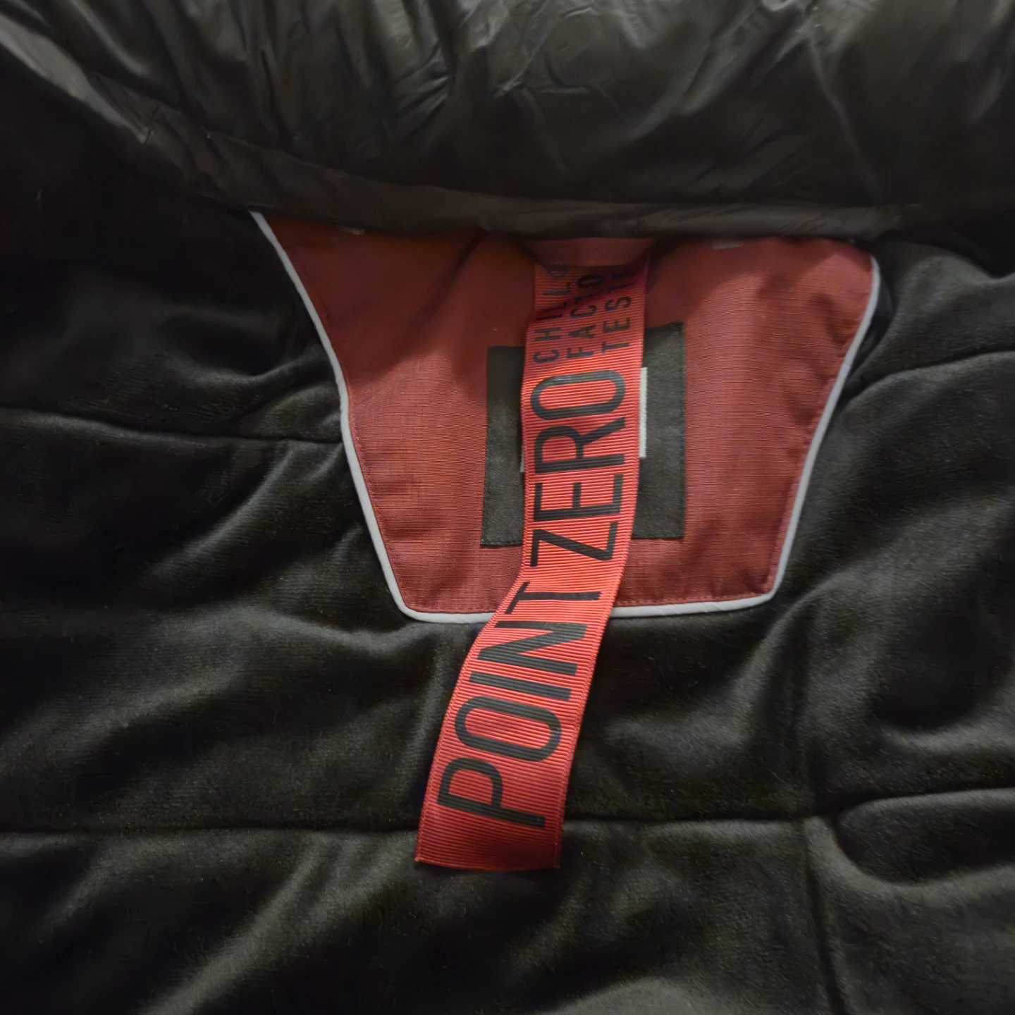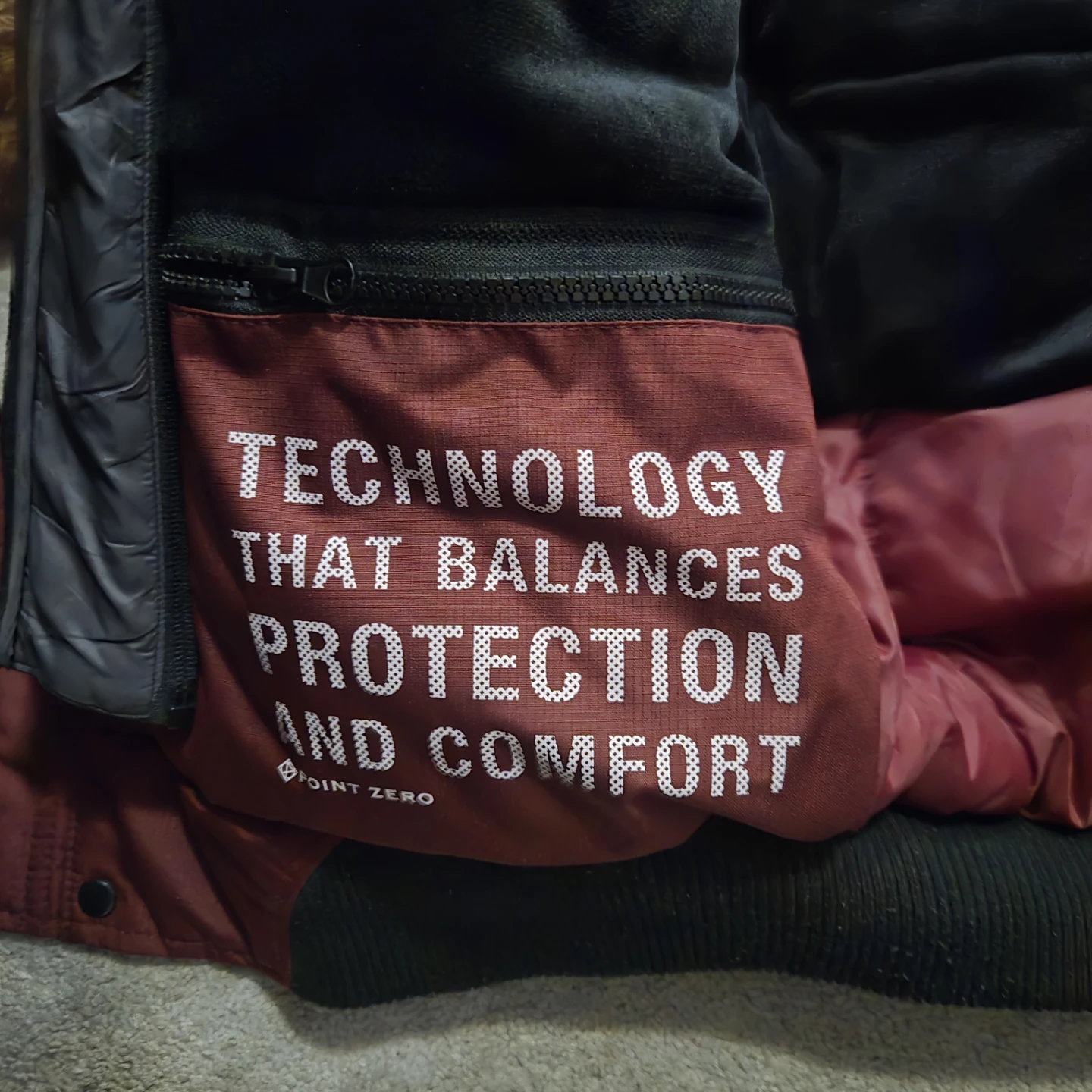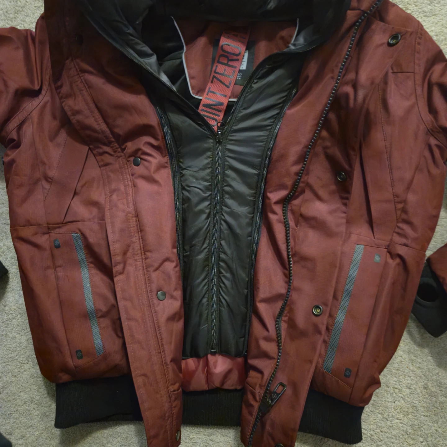 Point Zero ski jacket in a deep burgundy red, warm as hell and basically untouched. Hood snaps off, front zip adjusts, and the pockets are everywhere like they were trying to impress someone.