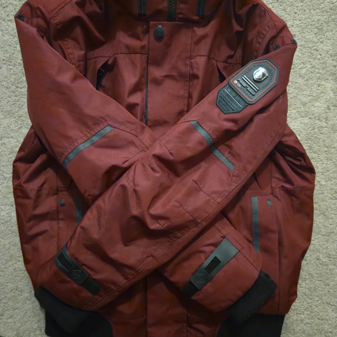 Tags: ski jacket winter gear cold weather outerwear burgundy coat padded jacket warm jacket Canada winter style