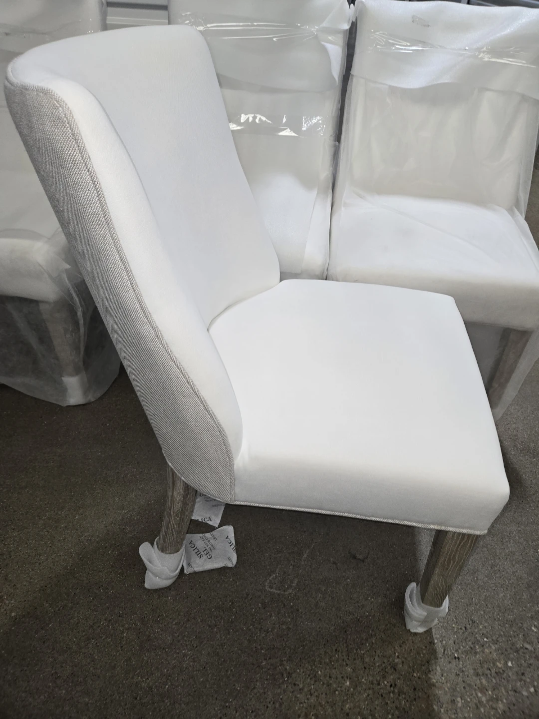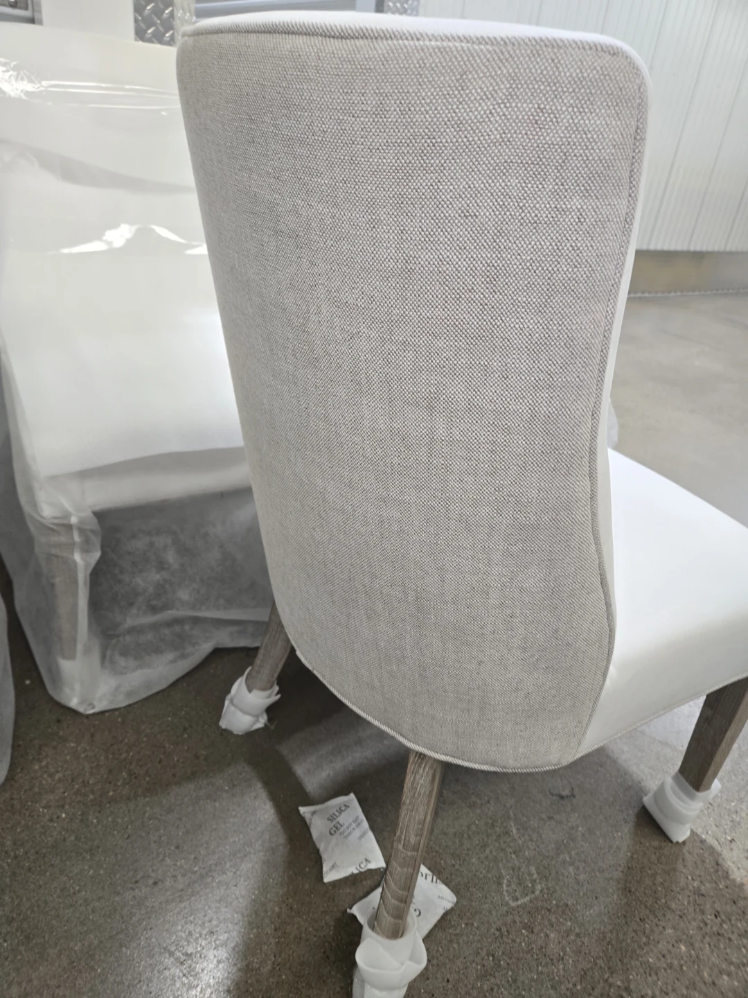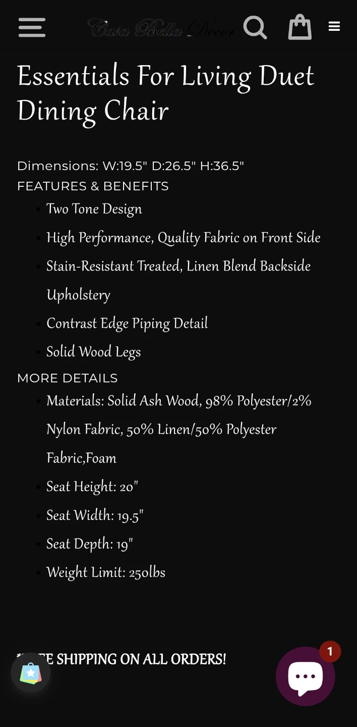 These Casa Bella Decor Essentials For Living Duet Dining Chairs are brand new and ready for your home! They have a two-tone design, with high-performance fabric on the front and a stain-resistant linen blend on the back. The dimensions are W:19.5" x D:26.5" x H:36.5". The frame is made of solid ash wood with 98% polyester/2% nylon fabric and 50% linen/50% polyester fabric and foam