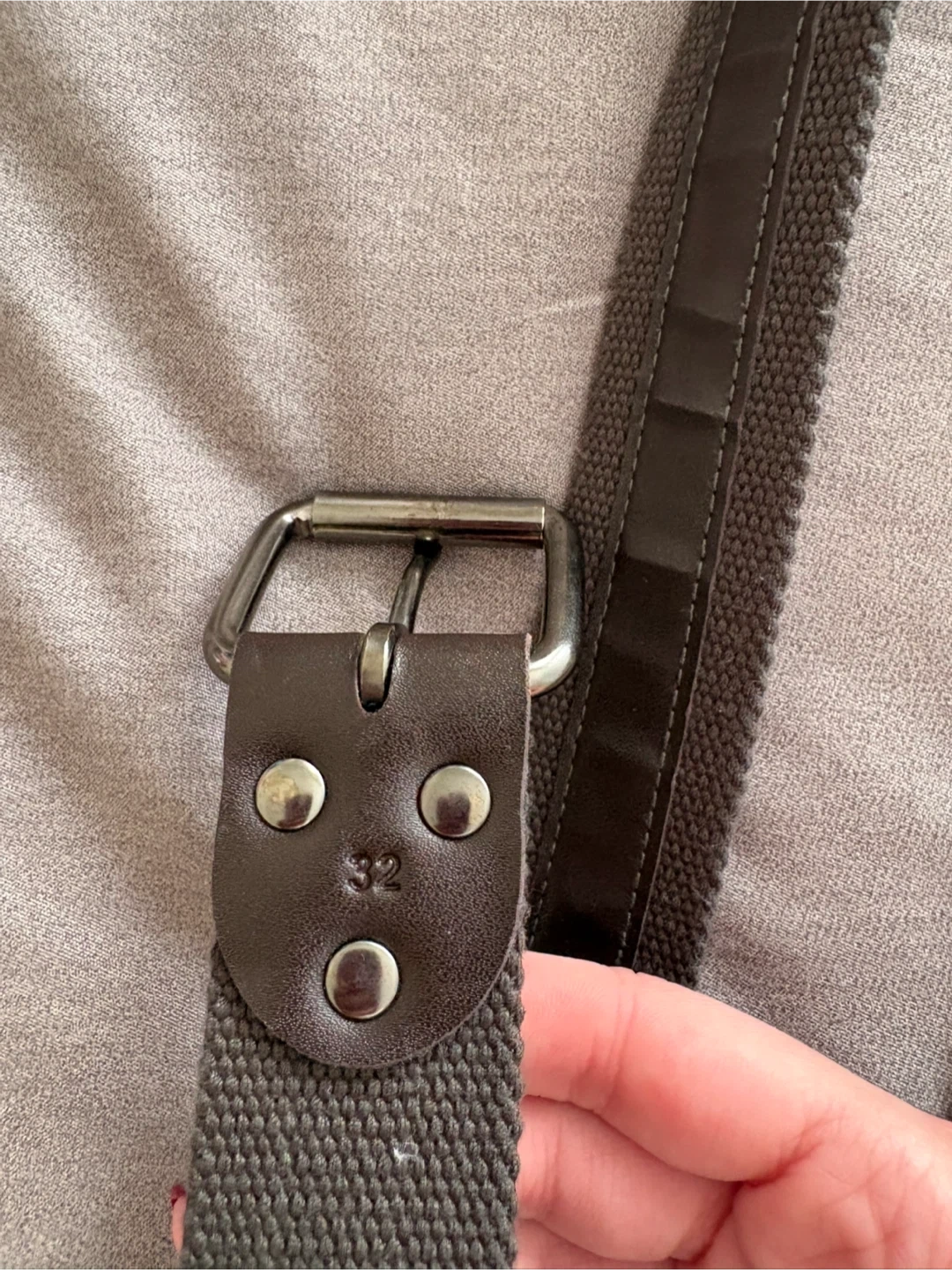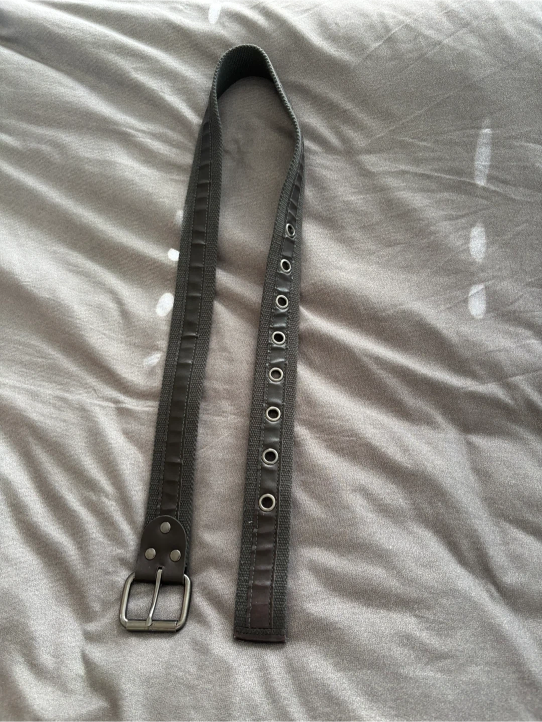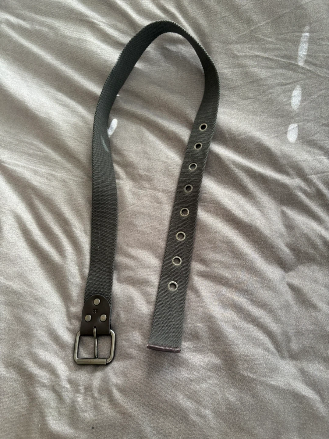 This is a grey canvas belt with a silver buckle and multiple grommets. It's size 32. Perfect for casual wear!