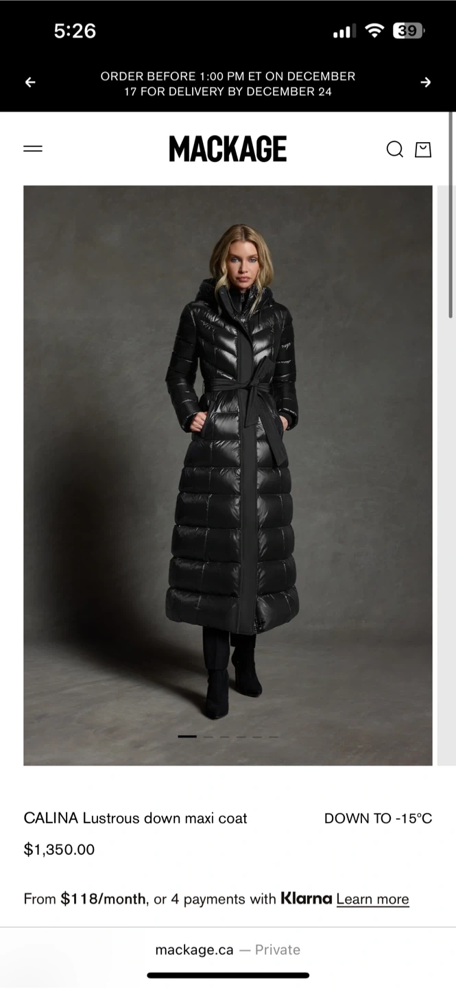 Selling a Mackage Calina lustrous down maxi coat! It's a beautiful, stylish, and warm coat perfect for cold Canadian winters. It's down to -15°C. Barely worn, retails for $1350+tax and selling for $500.