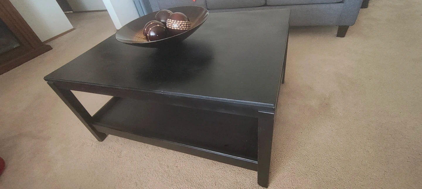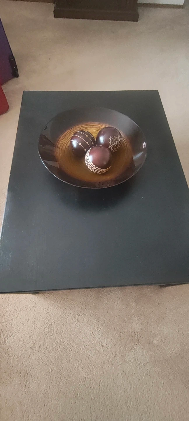 A wooden living room Centre table with decorative bowl with three ornamental spheres. The bowl has a warm, banded pattern with a dark rim. It's made of wood-like material.