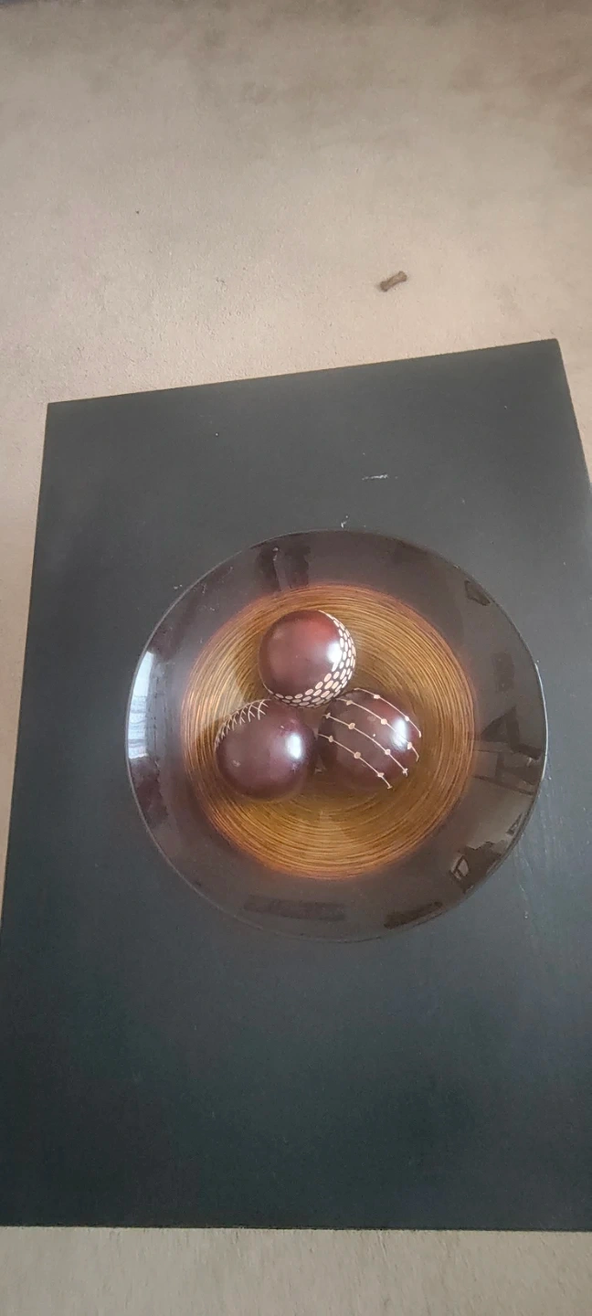 A wooden living room Centre table with decorative bowl with three ornamental spheres. The bowl has a warm, banded pattern with a dark rim. It's made of wood-like material.