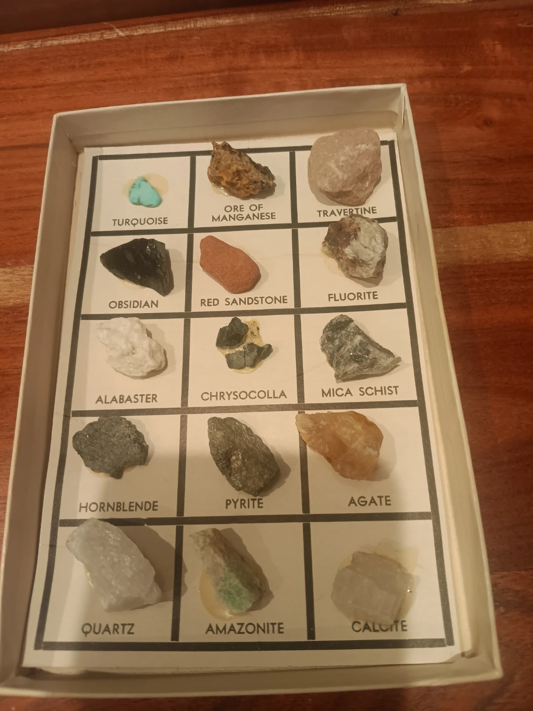 This vintage kit displays 15 common rocks and minerals with labels. Includes specimens like Turquoise, Obsidian, Alabaster, Quartz, and Calcite. Perfect for educational purposes or a unique display!