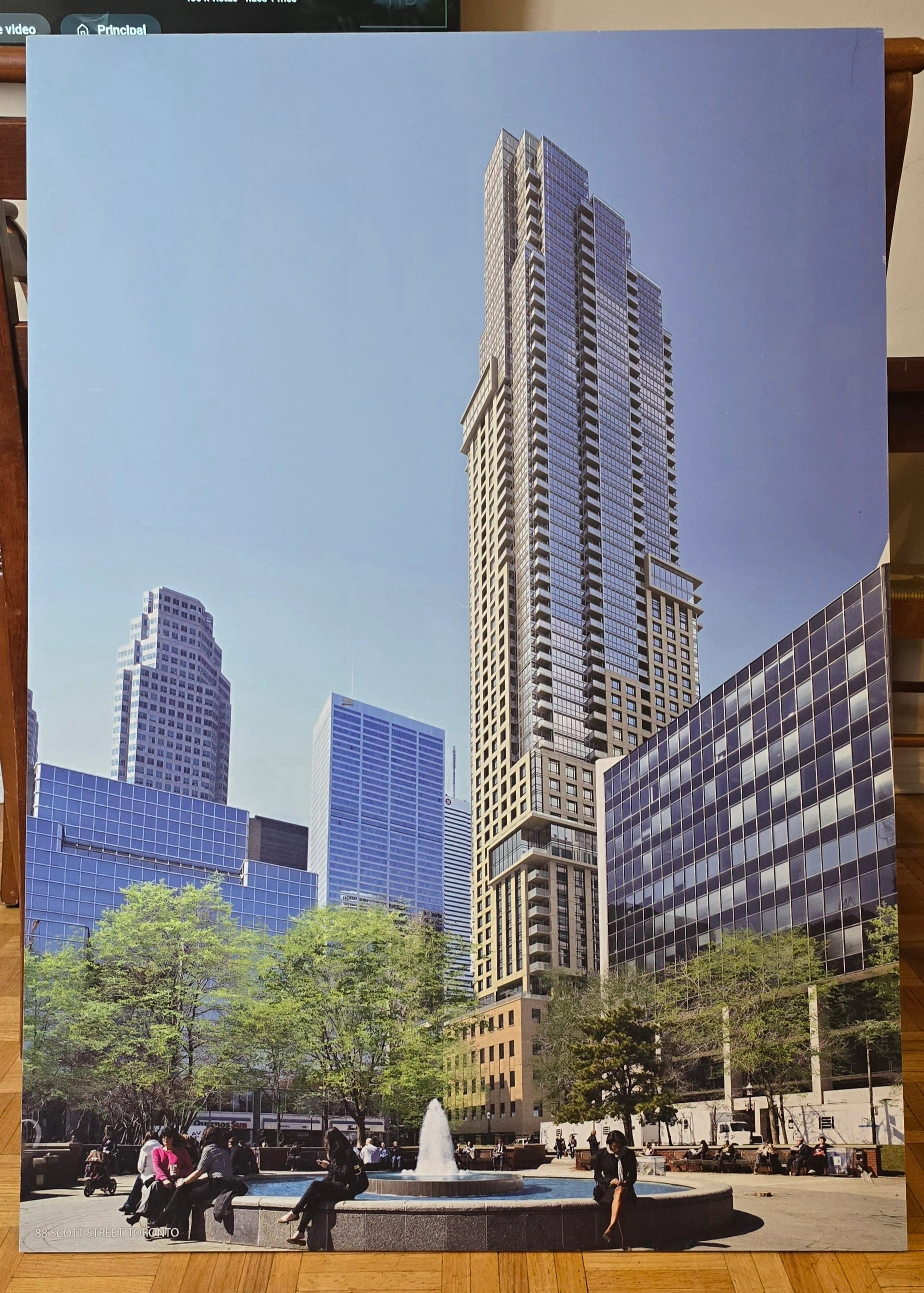 Large photographic print featuring a Toronto cityscape. Shows a modern highrise building and surrounding architecture. Printed on a semi-gloss surface. Excellent condition.