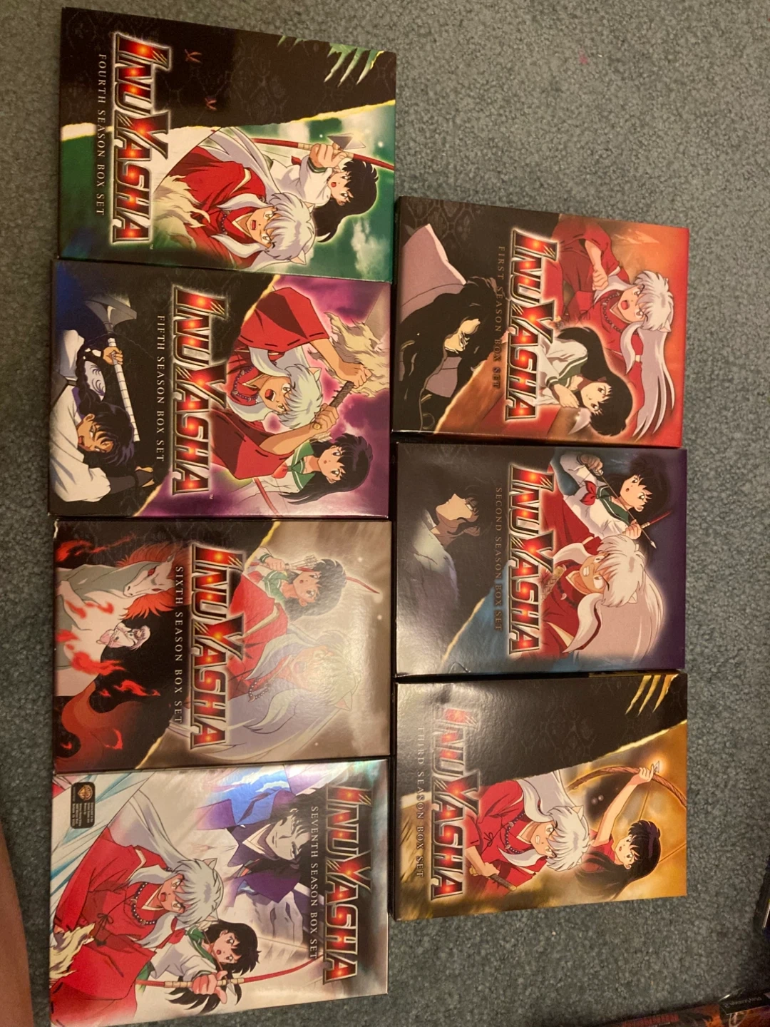 This is a collection of Inuyasha anime box sets, covering seasons four through seven. Each season is presented in its own box with unique artwork. It's a complete set for fans of the series!