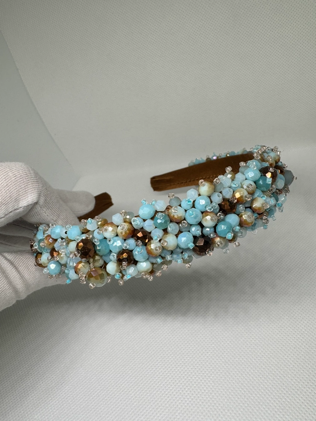 Unique beaded headband. Brown headband covered in light blue and brown beads. Perfect for special occasions.