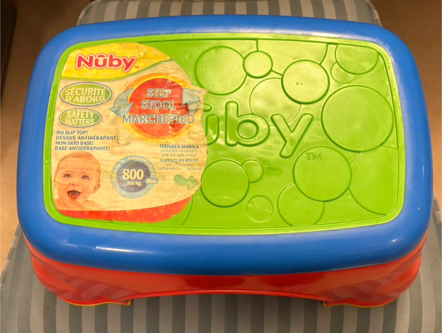 I'm selling a Nuby step stool, perfect for helping your little one reach new heights! It features a non-slip base for added safety and can support up to 800 lbs 😊